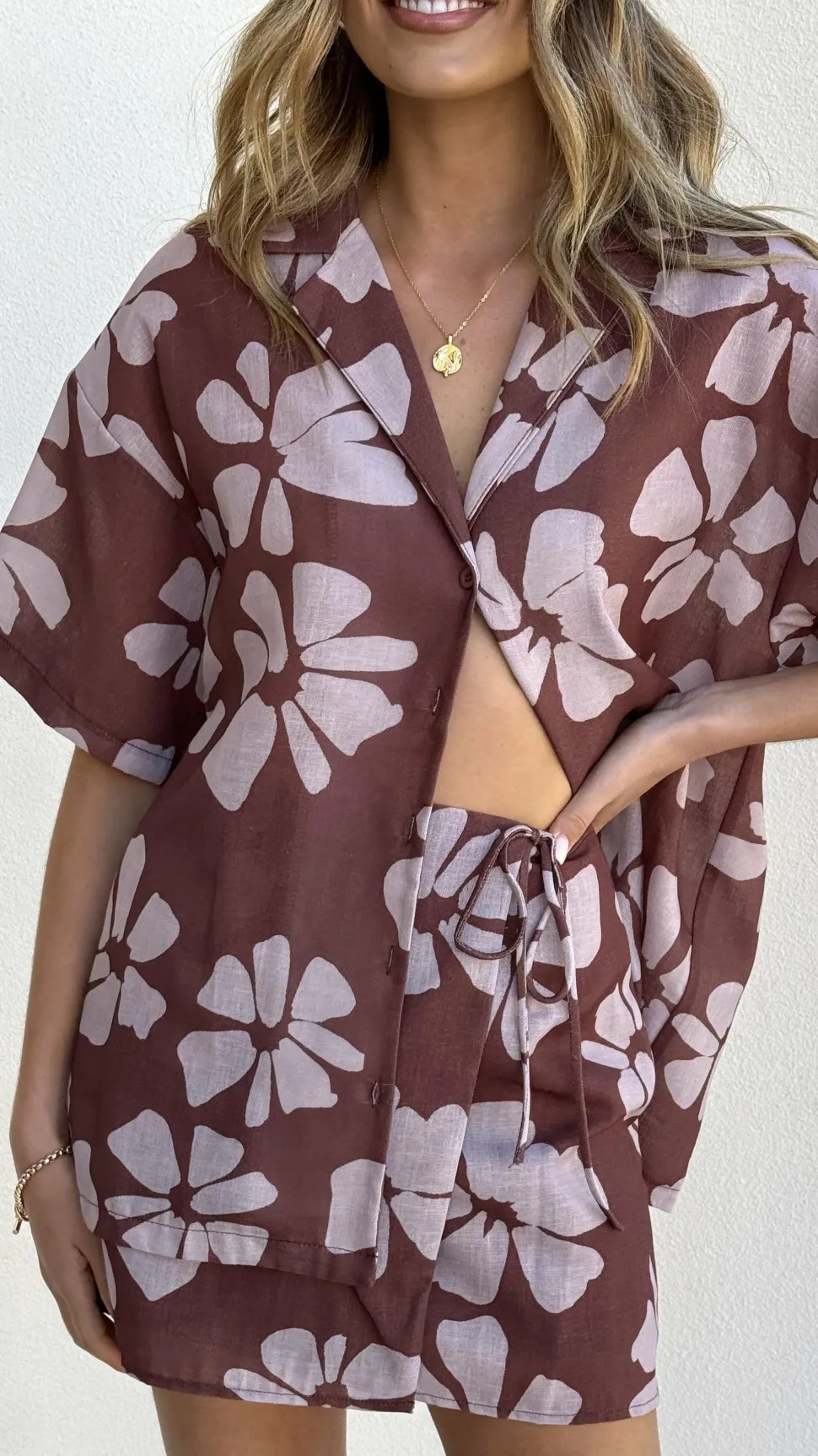 Get the look! Abilene Wrap Skirt – Brown Daylillies & Xami Heel – White