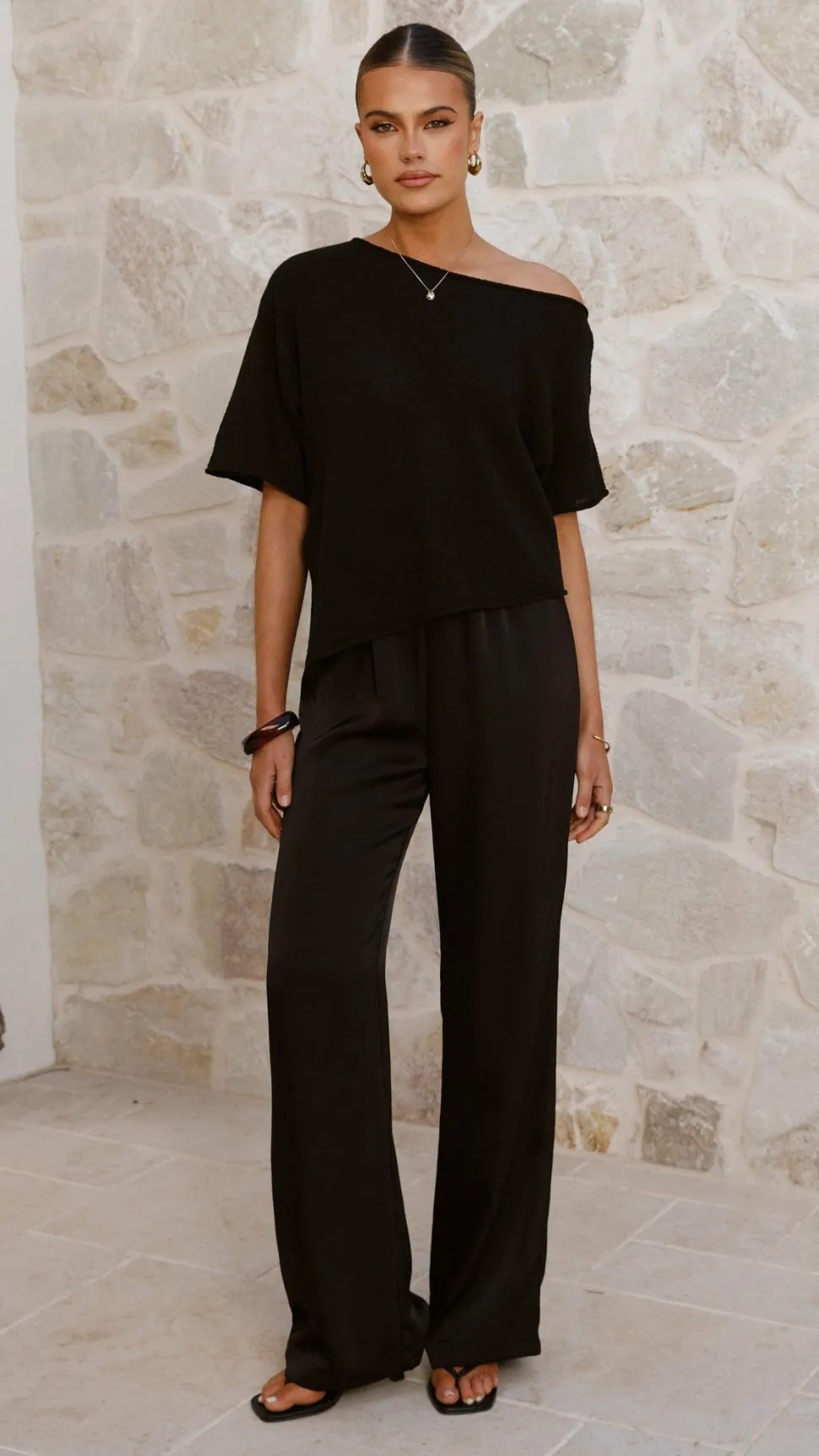 Elevate your wardrobe with the Blair Off Shoulder Tee in Black, crafted from a delicate knit fabric that offers a subtle semi-sheer effect. Its wide neckline and off-the-shoulder design create an elegant silhouette, while the rolled hems add refined detail. Perfect for sophisticated styling, this tee blends comfort with understated allure.
