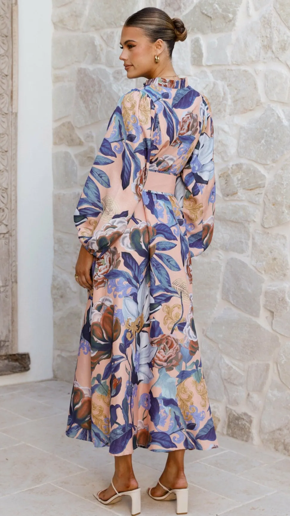 This maxi dress features a full-length silhouette with a button-down front and long balloon sleeves finished with elastic cuffs. It includes a detachable waistbelt for a customizable fit and is fully lined for comfort.