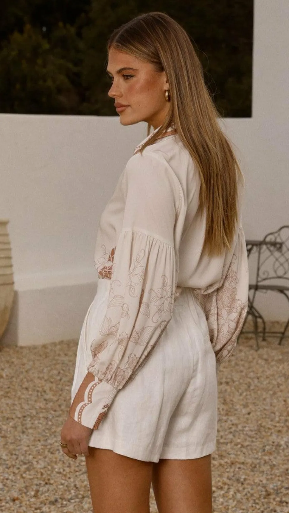 Get the look! Tillie Shorts – White & Olga Heel – Natural Raffia