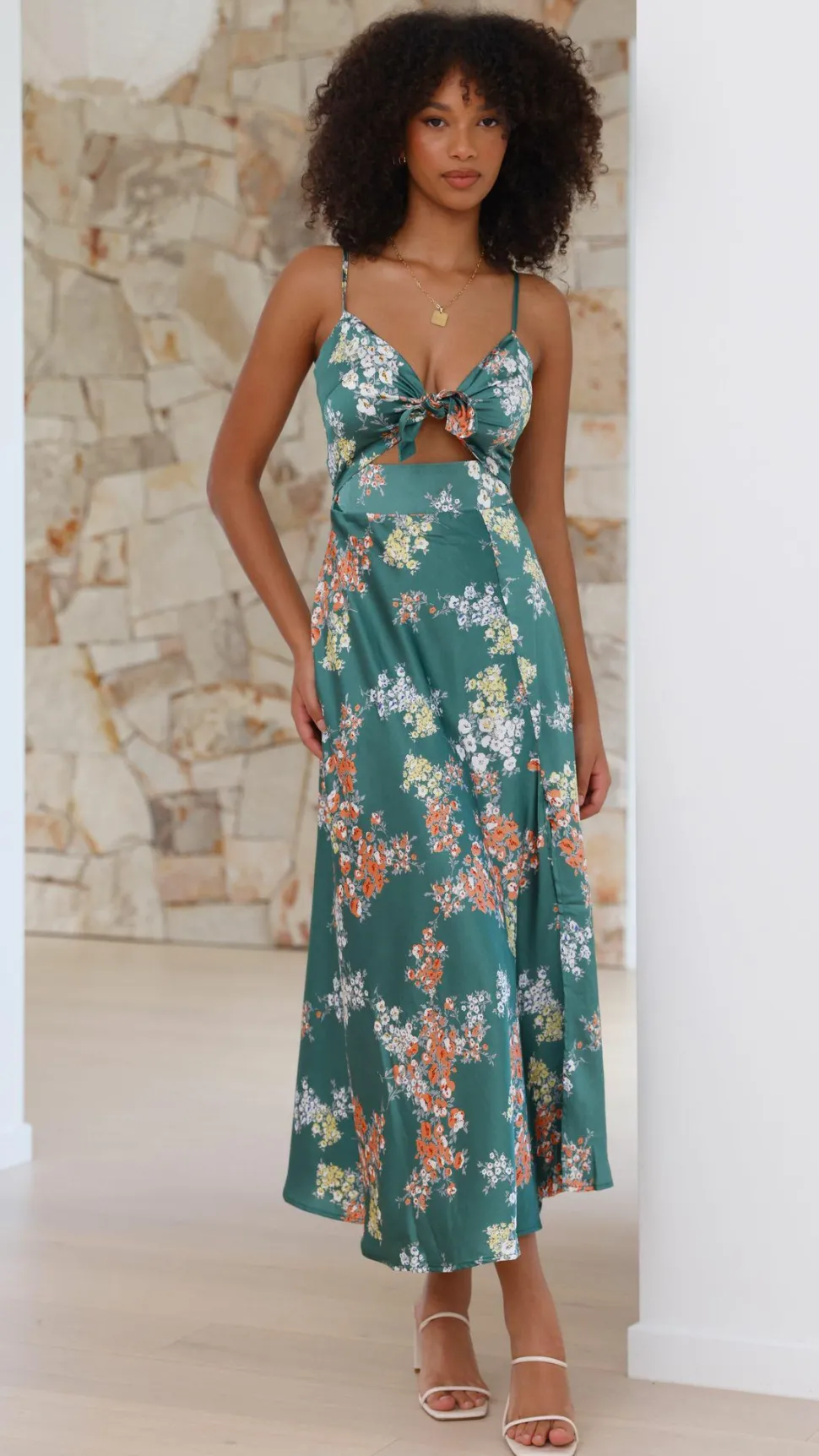 The Dreamers Midi Dress is an exquisite choice for any event, designed to make a memorable impression. It features a flattering tie-up bust detail, a fitted waistband with a stylish cut-out, and a front slit making this dress an essential addition to your collection.