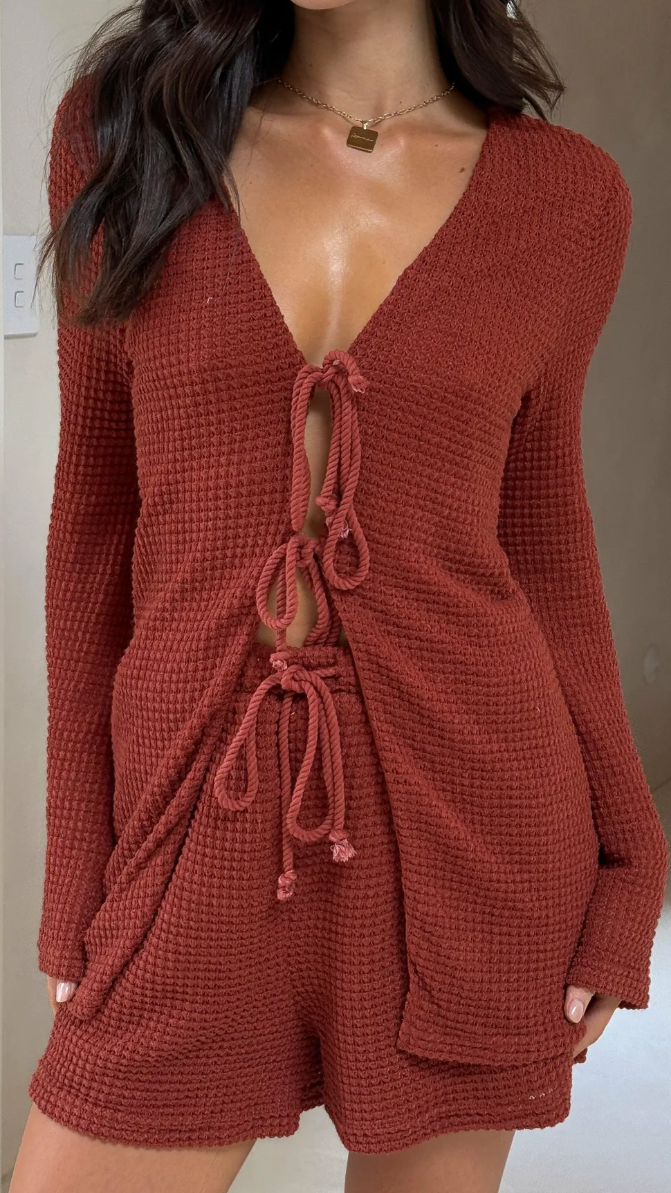 Get the look! Ava Long Sleeve Top – Rust & Yaelle Sandals – Teak