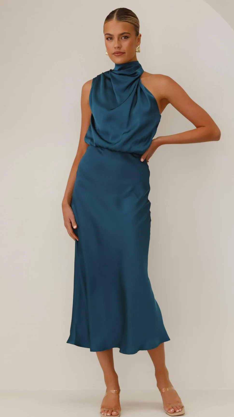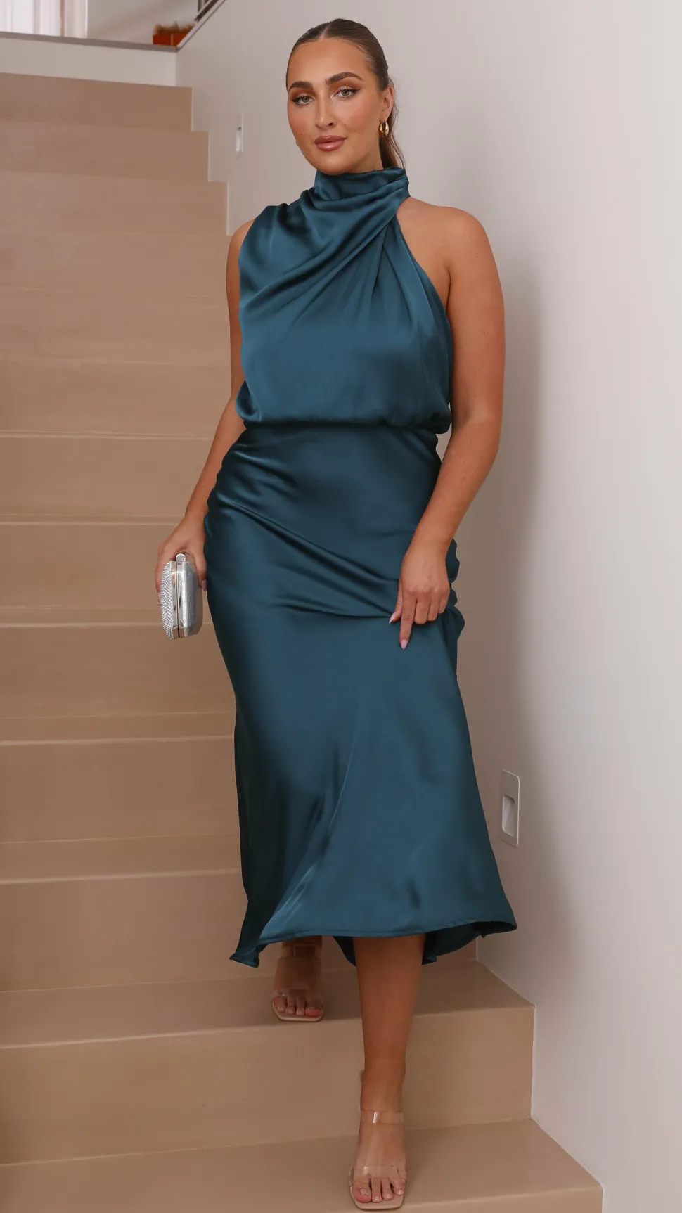 Our Esther Maxi Dress is the epitome of high class. This elegant high neck drape detailing makes this maxi the perfect choice for elegant wedding festivities. Adda nude bag and heels for that simple finishingtouch.
