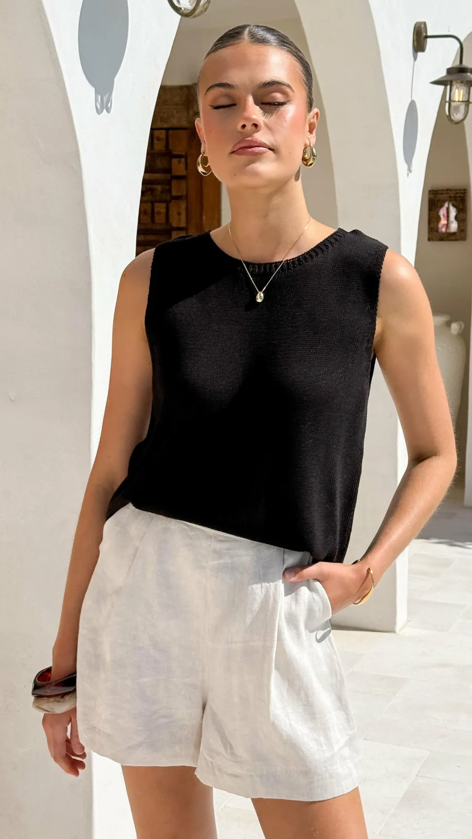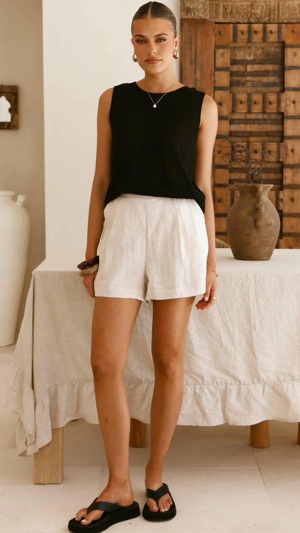 Get the look! Tillie Shorts – Natural,Lexi Linen Pants – White & Gretal Slide – Tan
