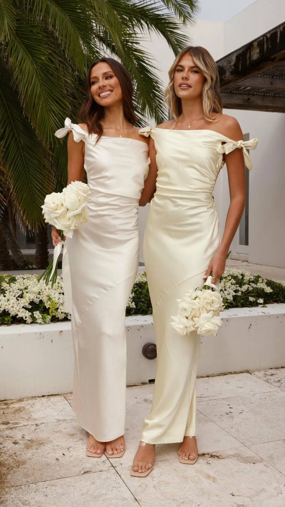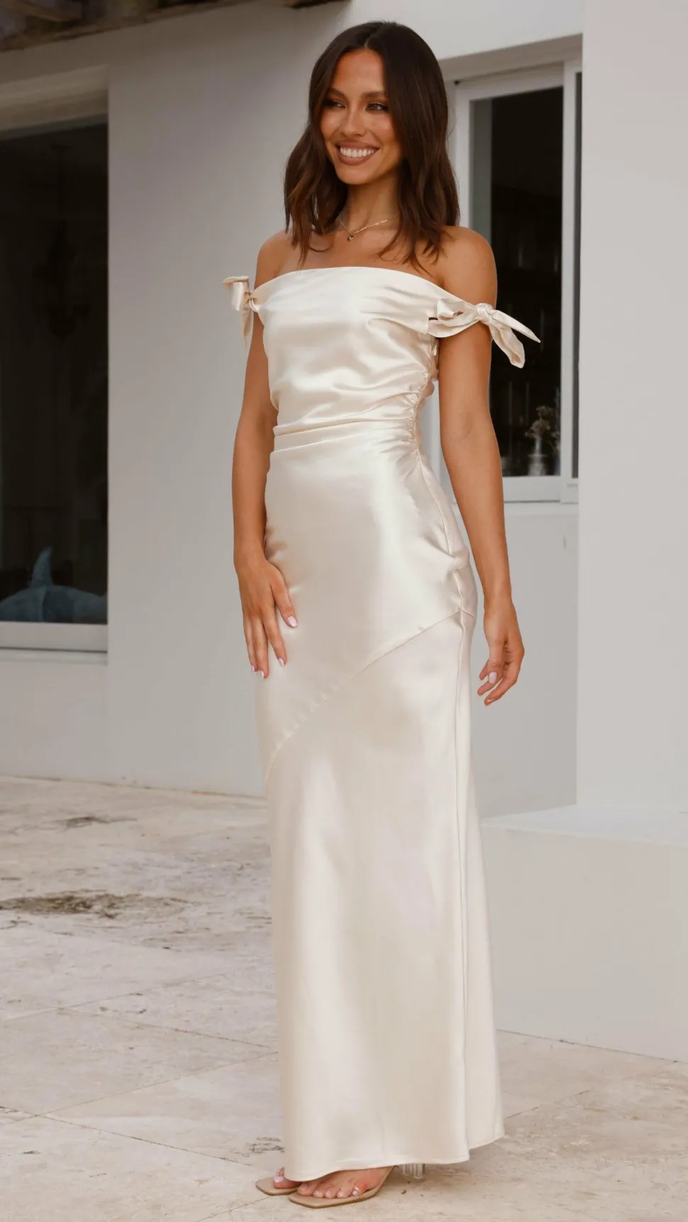 Turn heads and feel confident in the Frida Maxi Dress. This elegant style is perfect for bridesmaids or events. Its stunning off-the-shoulder design is complemented by a tie shoulder detail, adding a touch of sophistication. Just pair it with minimal jewelry, strappy heels and a clutch for a luxe finish.