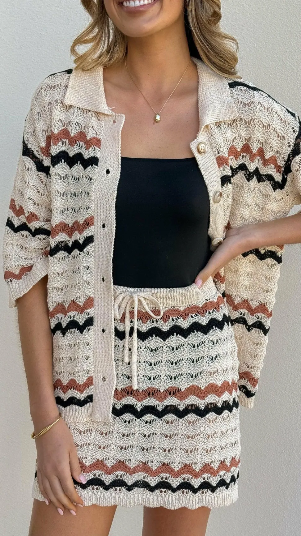Get the look! Greta Mini Skirt – Natural Stripe & Amaya Slide – Clay