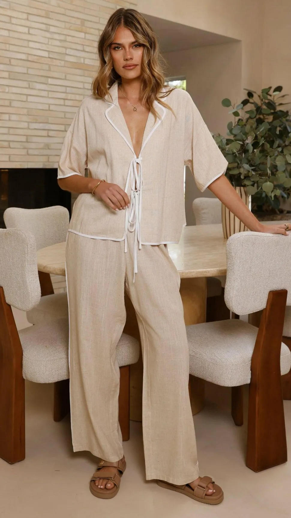 Get the look! Amylee Slide – Light Cashew & Hartley Pants – Beige / White