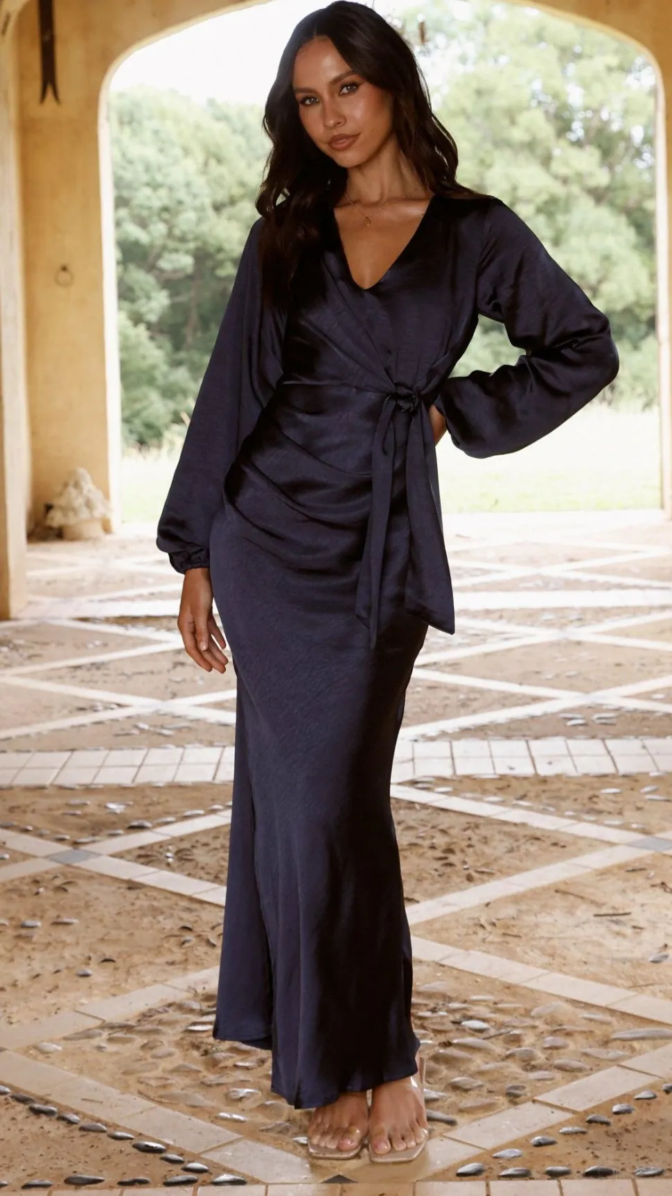 This elegant maxi dress features a flattering V-neckline and a stylish front tie detail. Designed with long balloon sleeves and an invisible back zip for a seamless look, it also includes side gathers and a leg split for added movement. Fully lined for comfort, this navy dress offers a refined silhouette perfect for any occasion.