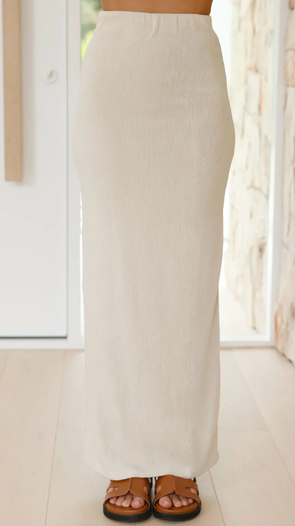 Get the look! Kahili Asymmetrical Top – Oat & Theon Slides – Tan