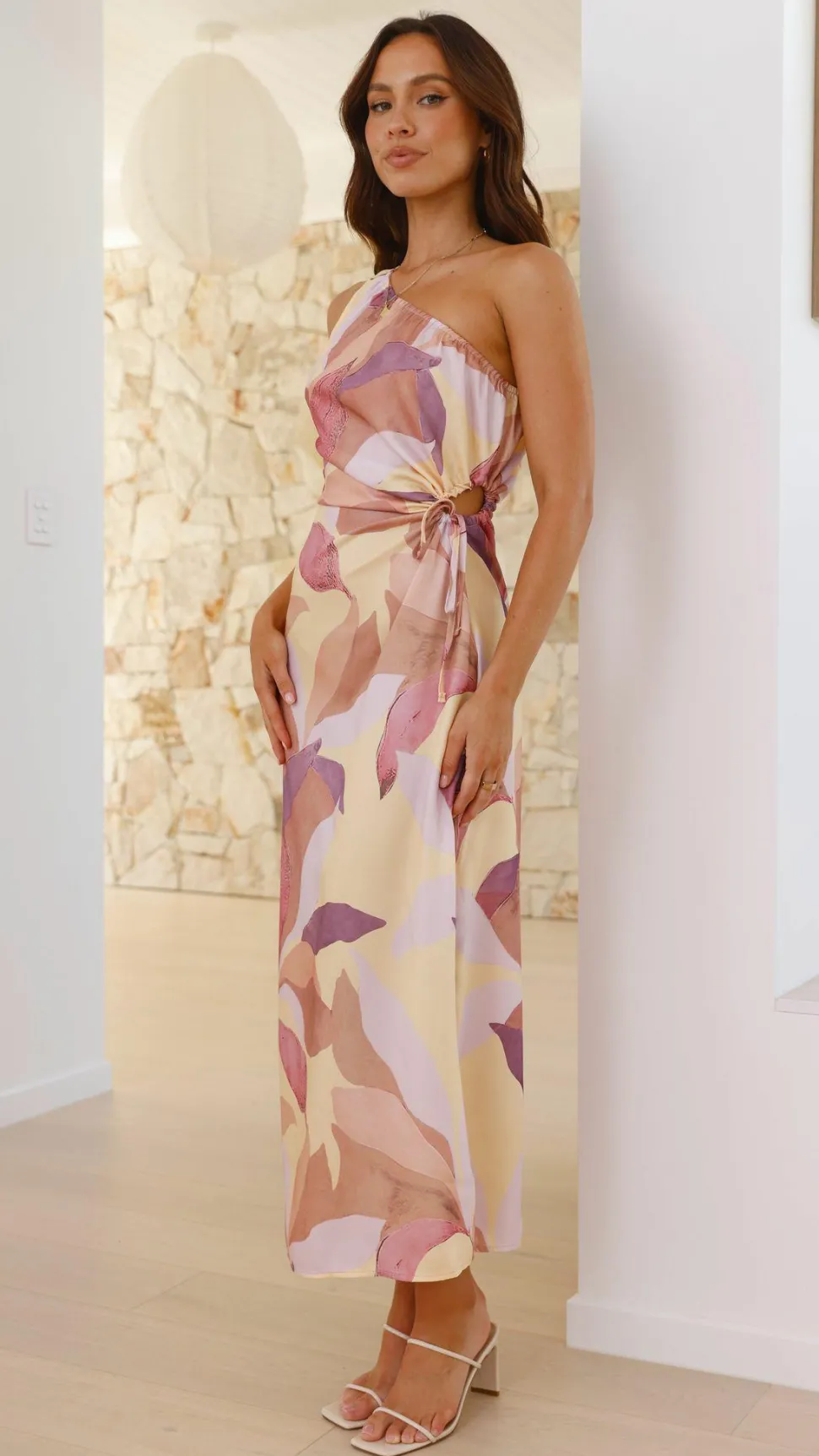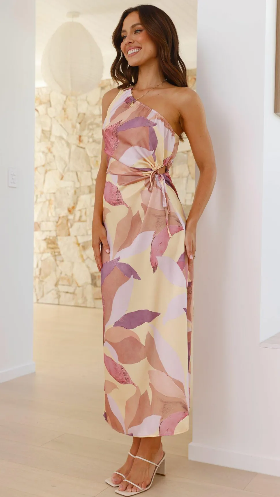 This maxi dress showcases a one-shoulder silhouette with an elasticated neckline and an invisible side zipper. It features a side cutout with an adjustable drawstring tie and a side leg split, all crafted without lining for a lightweight, elegant look.