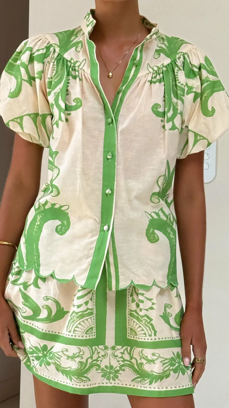 Get the look! Laraine Mini Skirt – Sage / Cream & Yazmin Heel – White