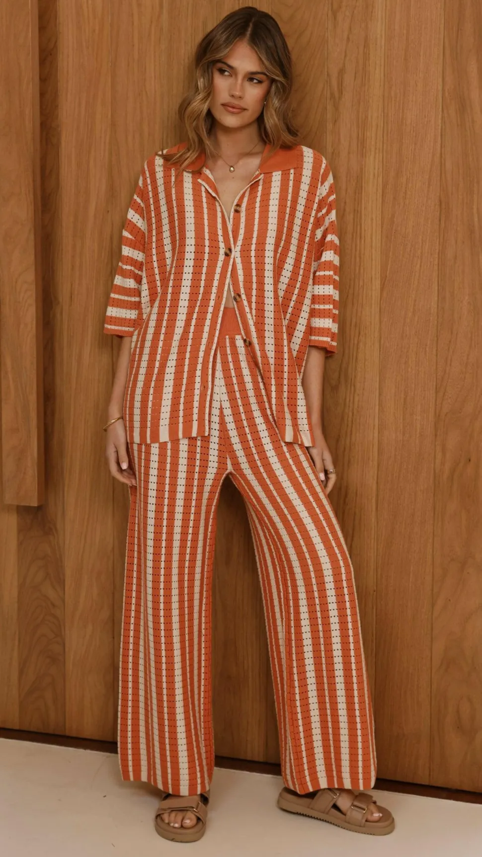 Get the look! Amylee Slide – Light Cashew & Layla Knit Wide Leg Pants – Orange