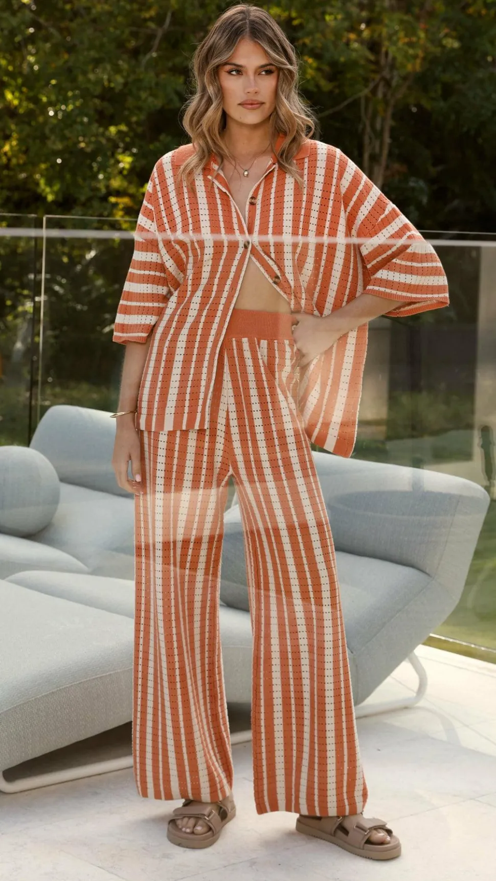 Get the look! Amylee Slide – Light Cashew & Layla Button Up Knit Shirt – Orange