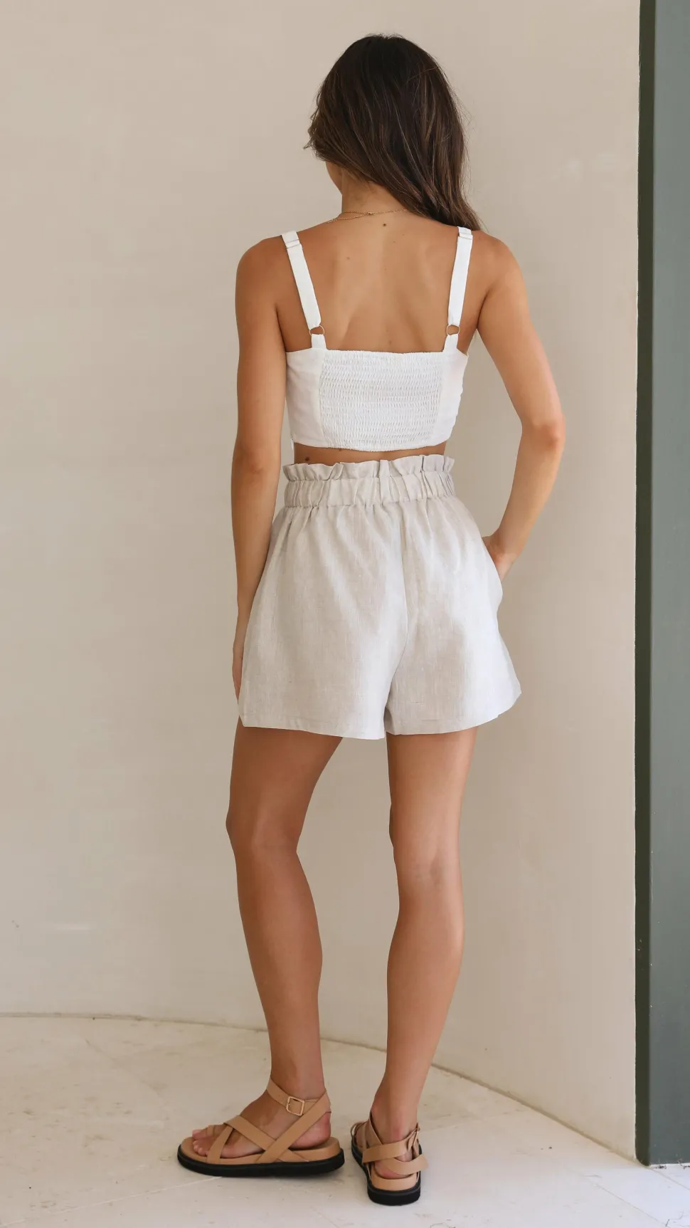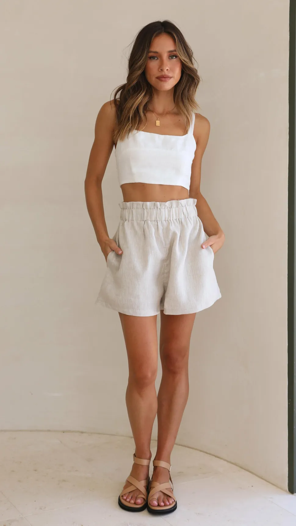 Get the look! Paros Top – White, Milsey Crop Top – WhiteandZariah Slide – Desert