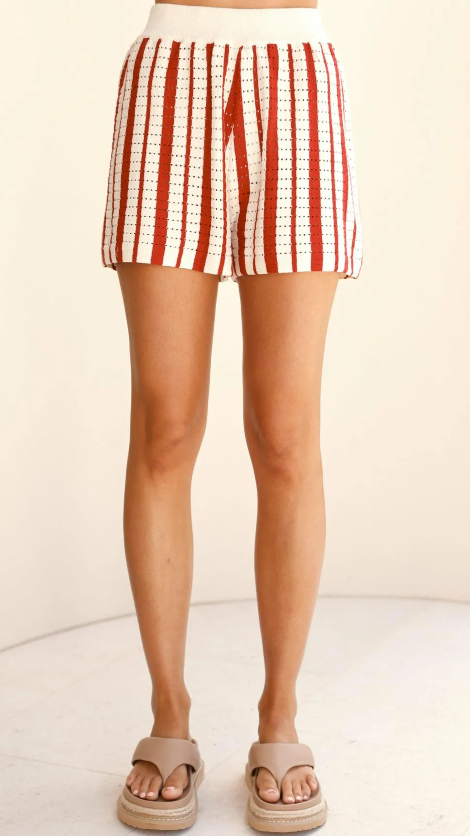Get the look! Leonie Short Sleeve Knit Top – Red & Amaya Slide – Clay