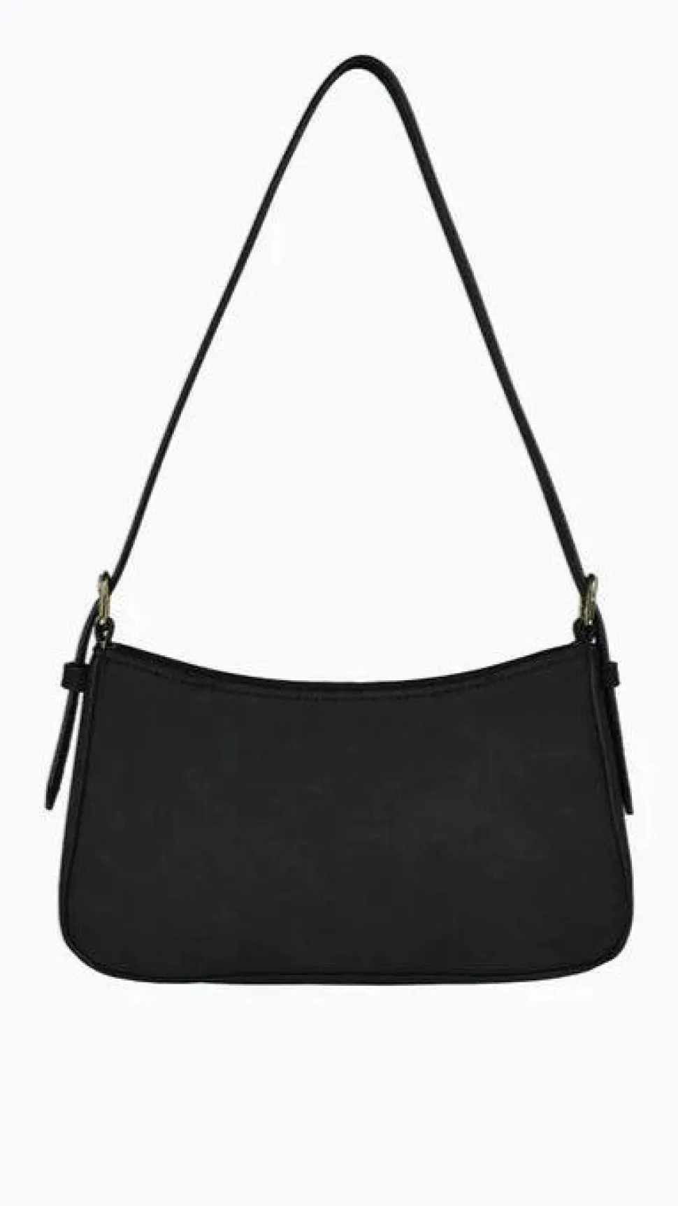 – The bag features a fixed, adjustable shoulder strap with buckle detail and gold hardware.