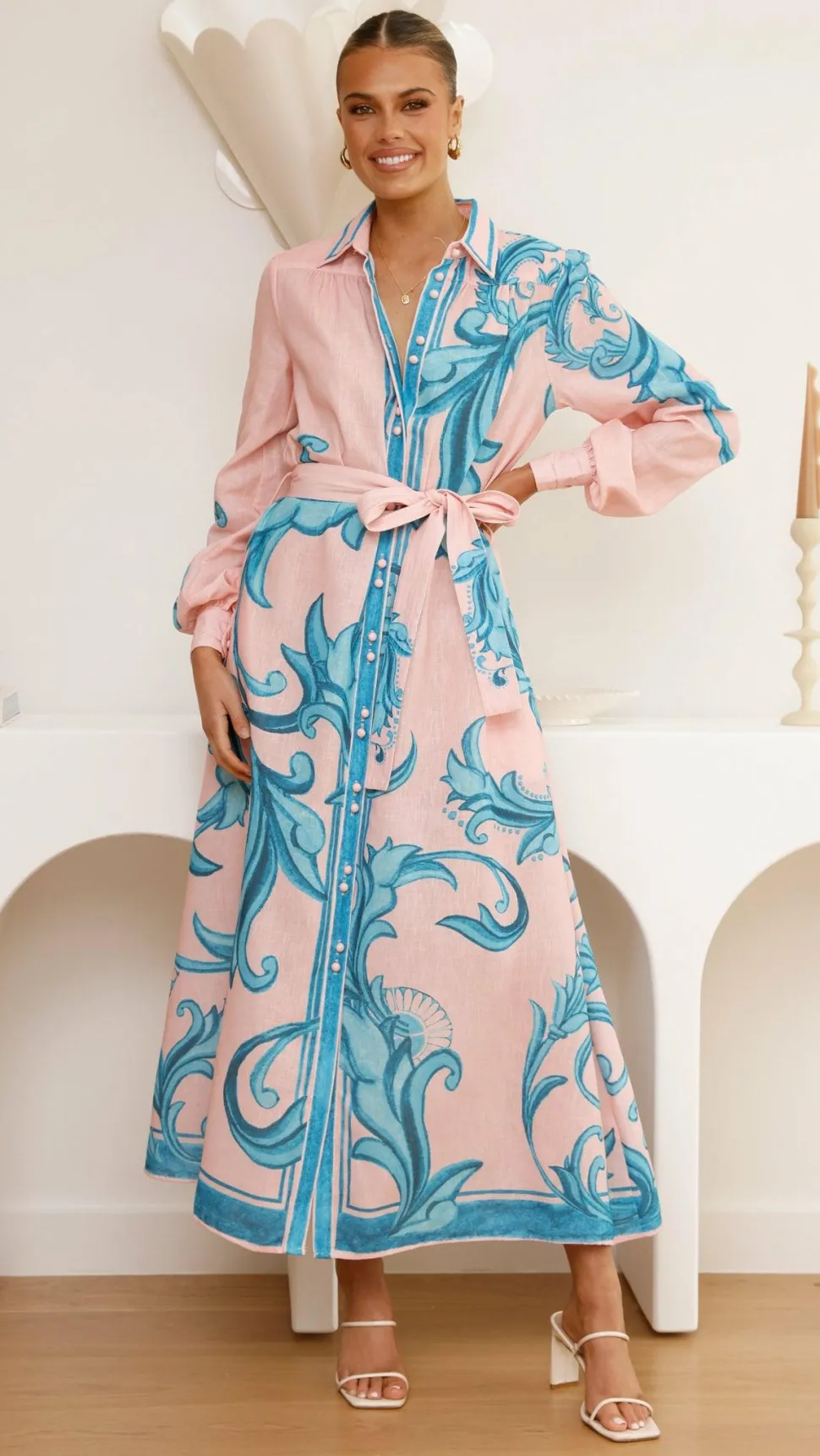 The Lucia Long Sleeve Maxi Dress in Aqua/Pink Print features a classic collared design with a button-up front for effortless elegance. Its long sleeves are finished with double button cuffs, adding a refined touch. Practical side pockets combine style with convenience, while the detachable waist belt allows you to customize your silhouette for a polished, sophisticated look. Perfect for any occasion that calls for timeless grace.