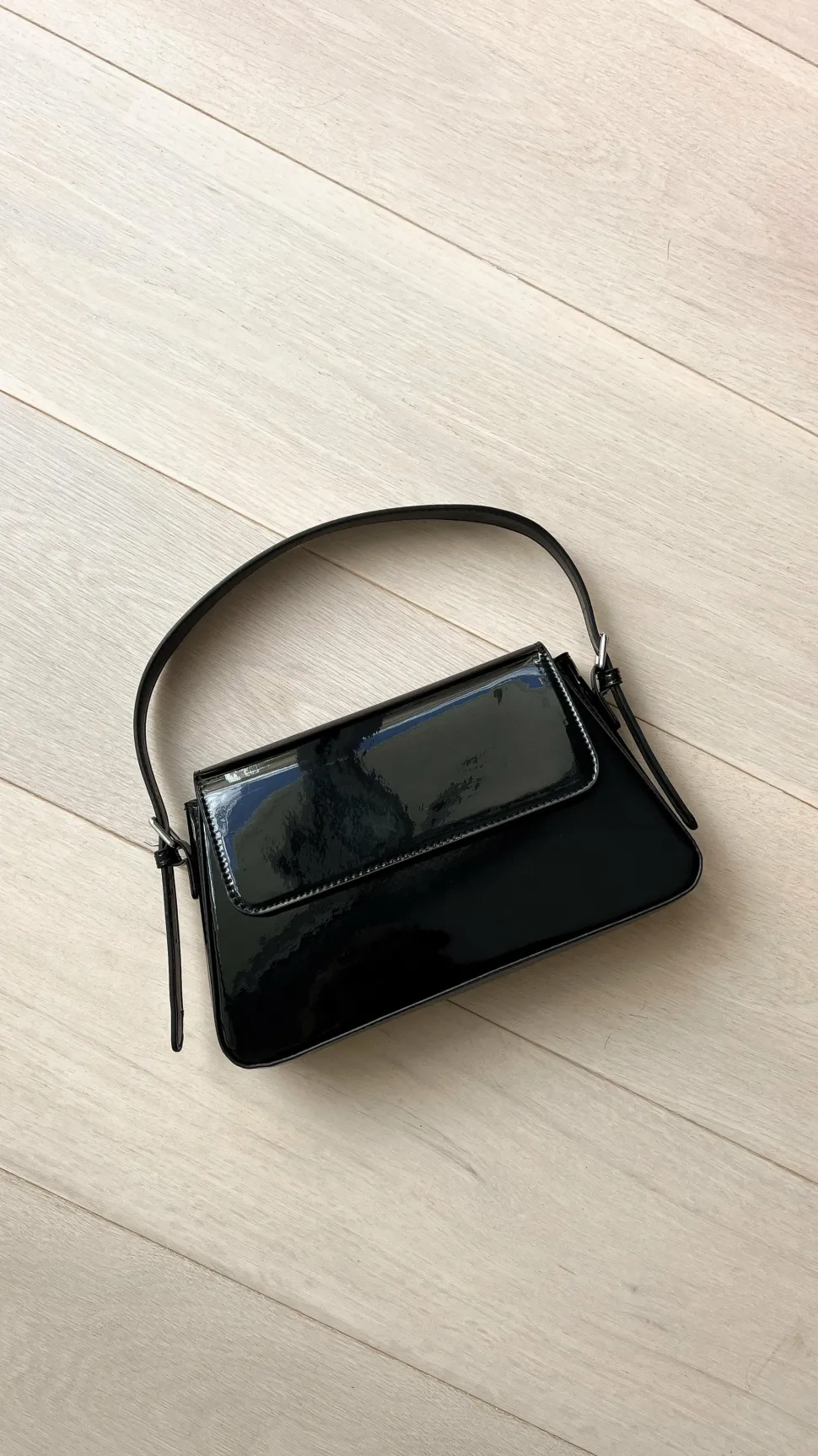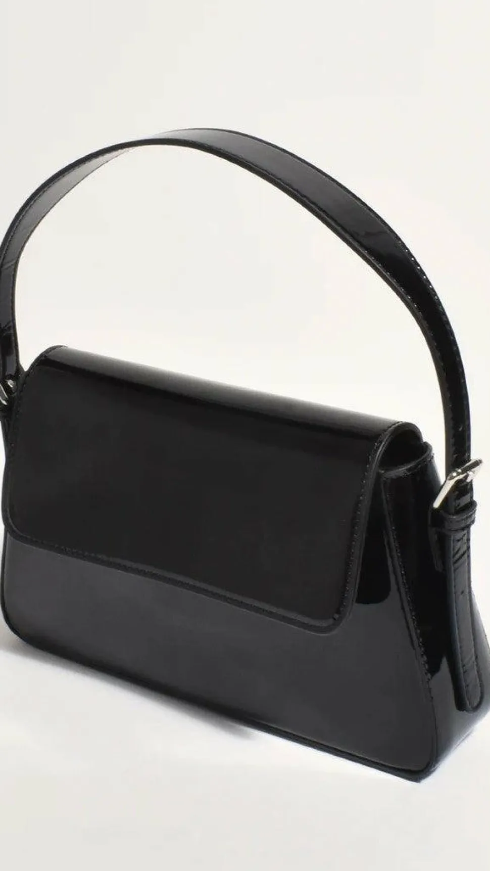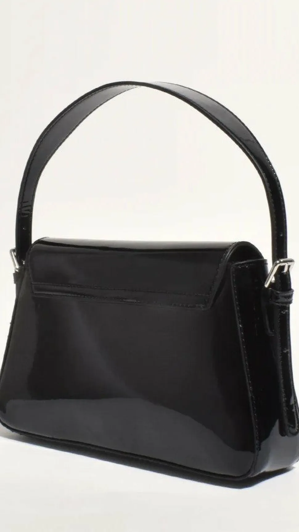 The Maisie High Shine Handbag offers a sleek, sophisticated look with itspatent black exterior that will elevate your wardrobe. Perfect for day-to-night style, this handbag boasts ample storage and a stylish design.