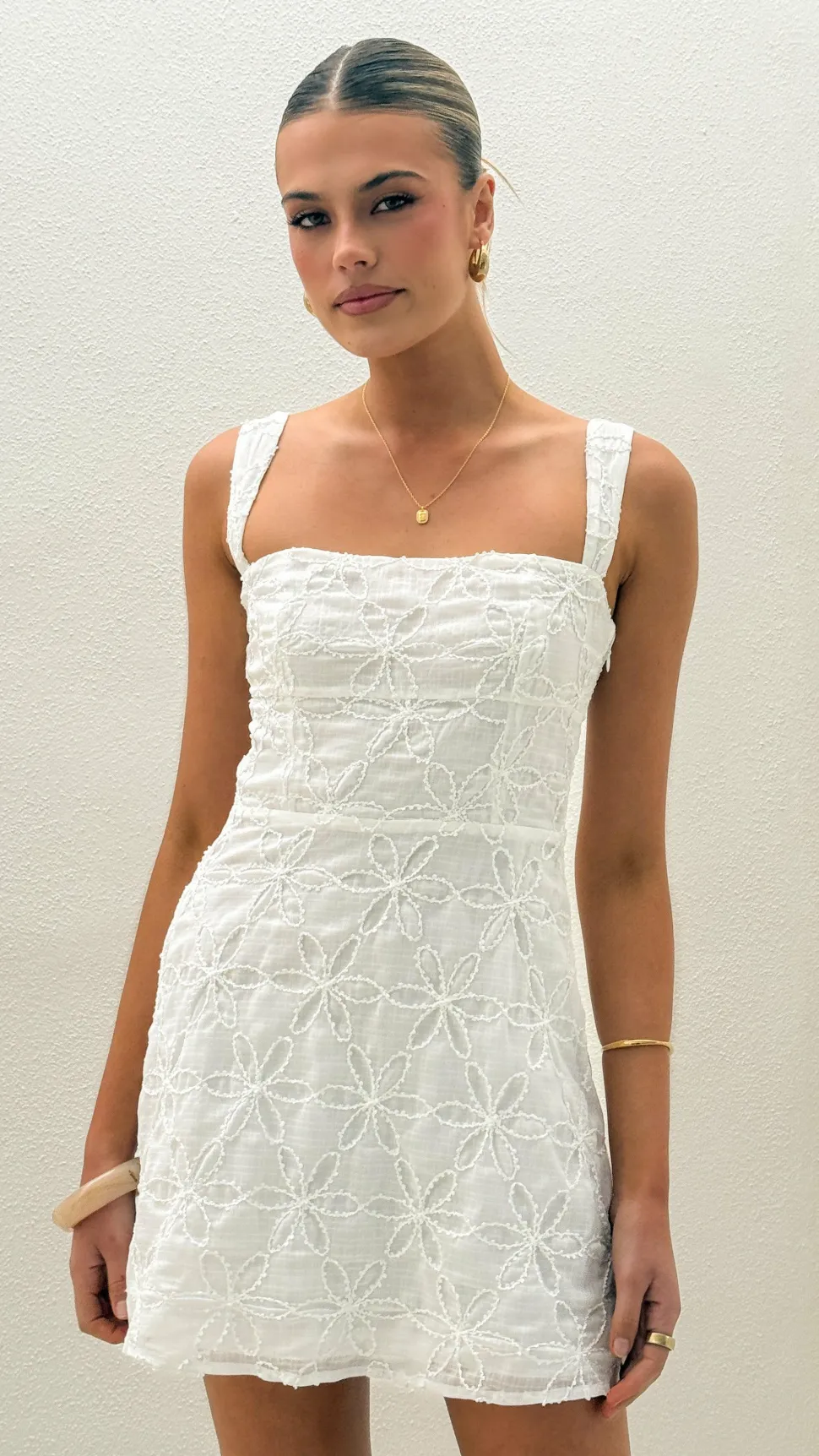 This delicate white lace mini dress is designed with adjustable straps and a square neckline for a personalized and flattering fit. Its thick elastic backband and hidden side zipper provide gentle support and easy dressing. Fully lined and made from 100% cotton, it ensures breathable comfort throughout the day.
