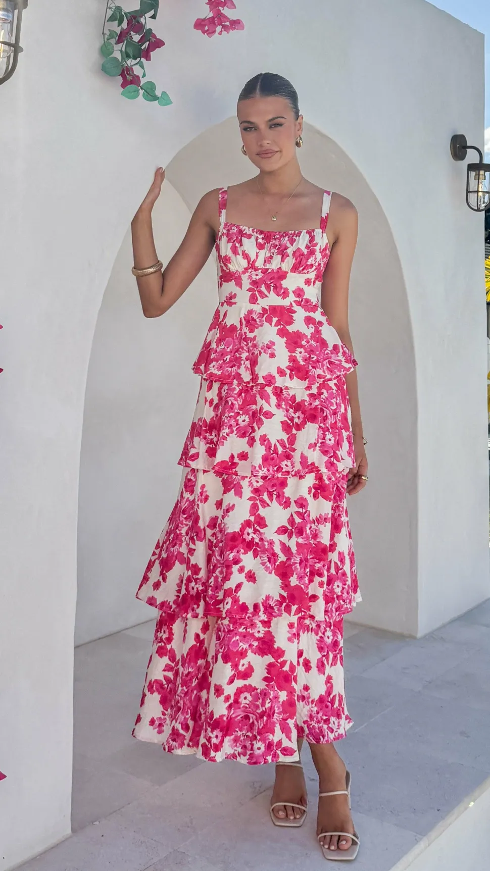 This elegant maxi dress showcases adjustable straps and a gathered bust for a flattering fit. The ruffled skirt adds a touch of femininity, while a tie-up bow at the back enhances its refined silhouette. Finished with an invisible back zip and full lining, it offers both style and comfort.
