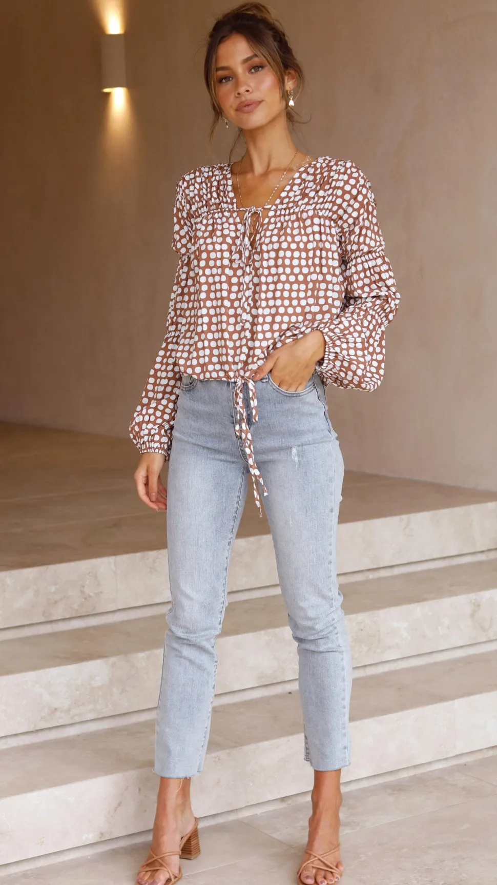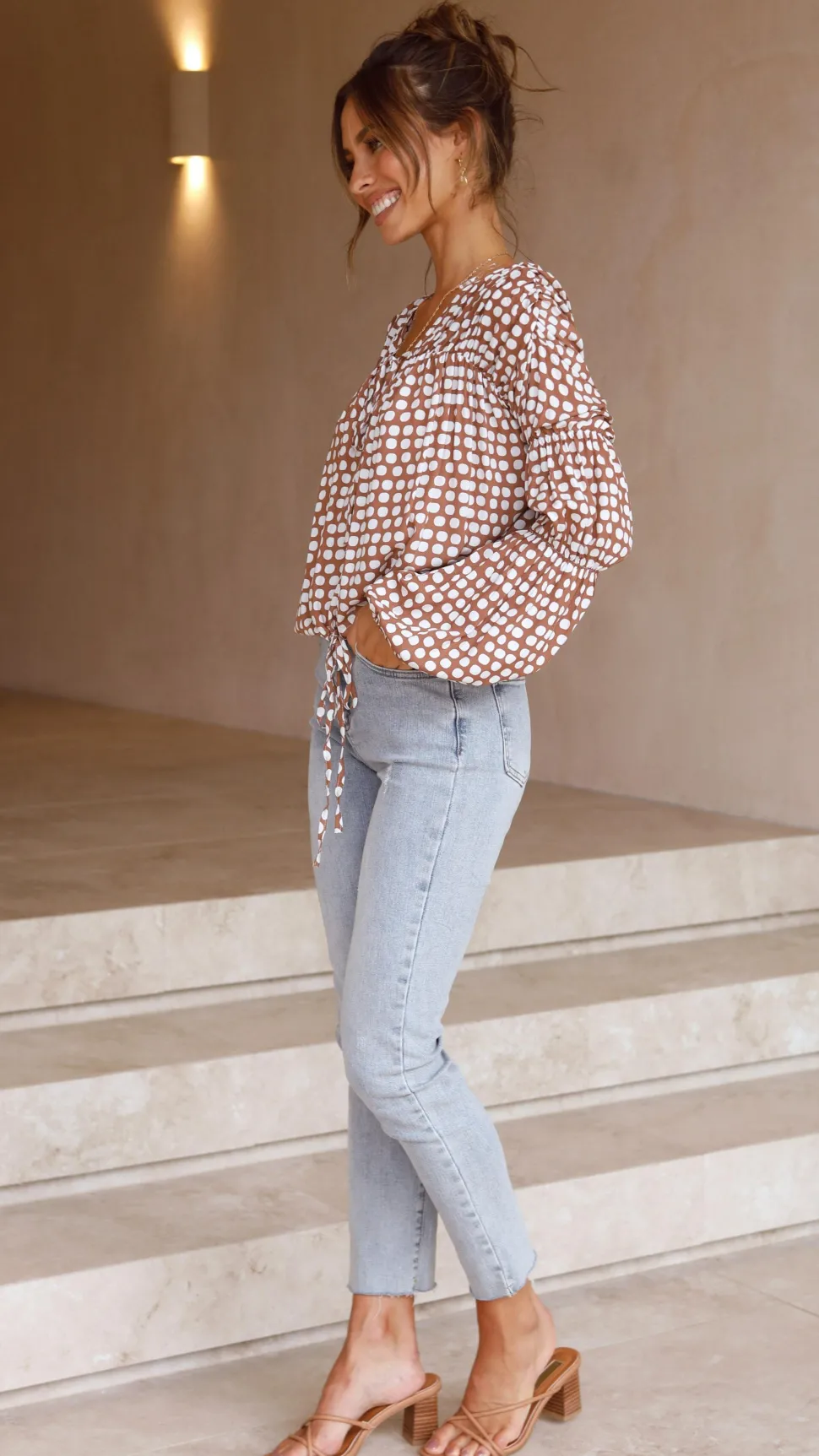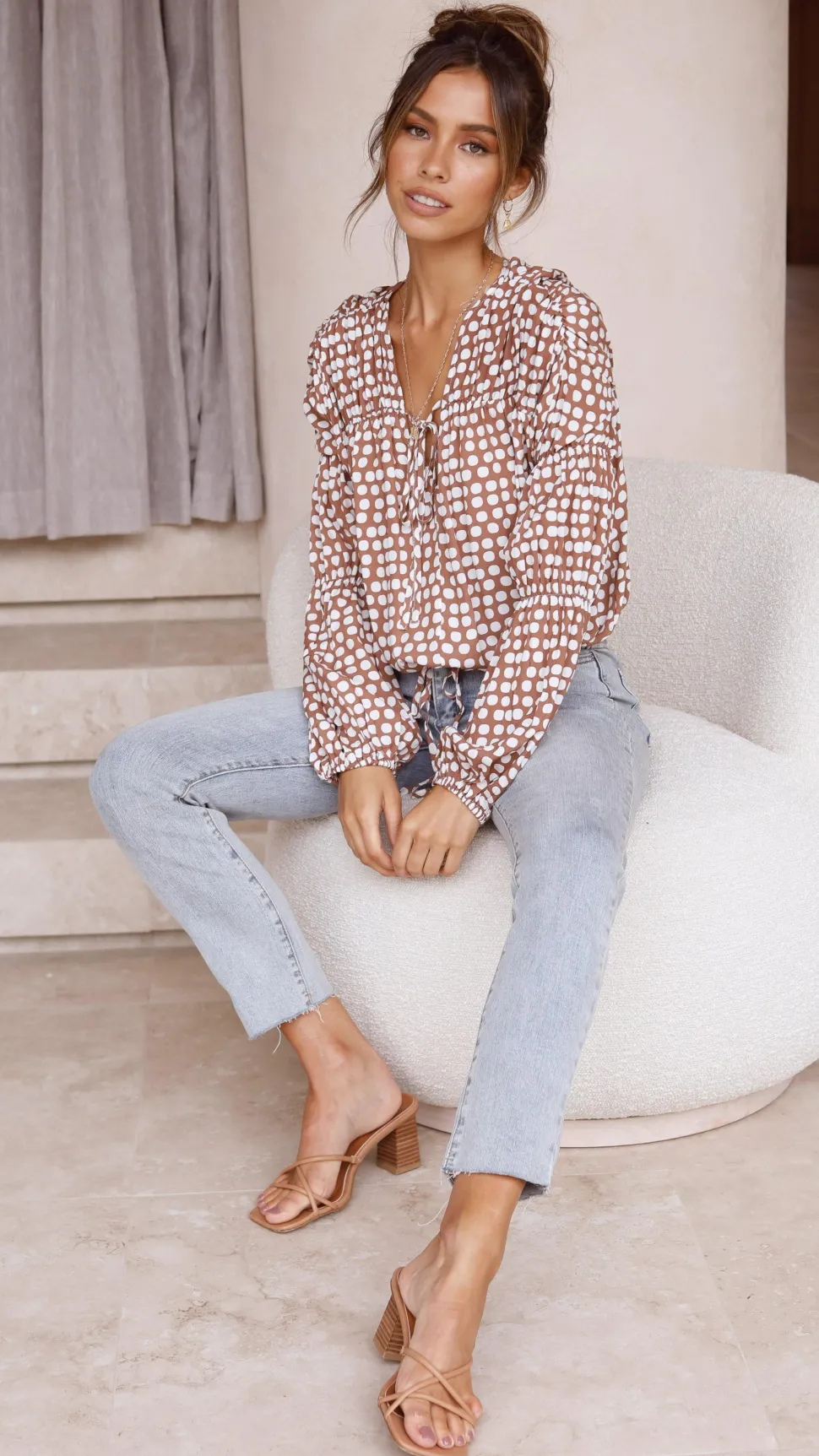 The Orane Top in Brown Spot combines stylish details with comfortable wear. Featuring an adjustable drawstring hem and tie detailing at the bust, it allows you to customize your fit while adding a feminine touch. Ruched accents and elasticated sleeve hems enhance the silhouette and provide ease of movement. Crafted from soft rayon, this top offers breathable comfort perfect for any occasion. Elevate your wardrobe with this versatile and flattering piece.