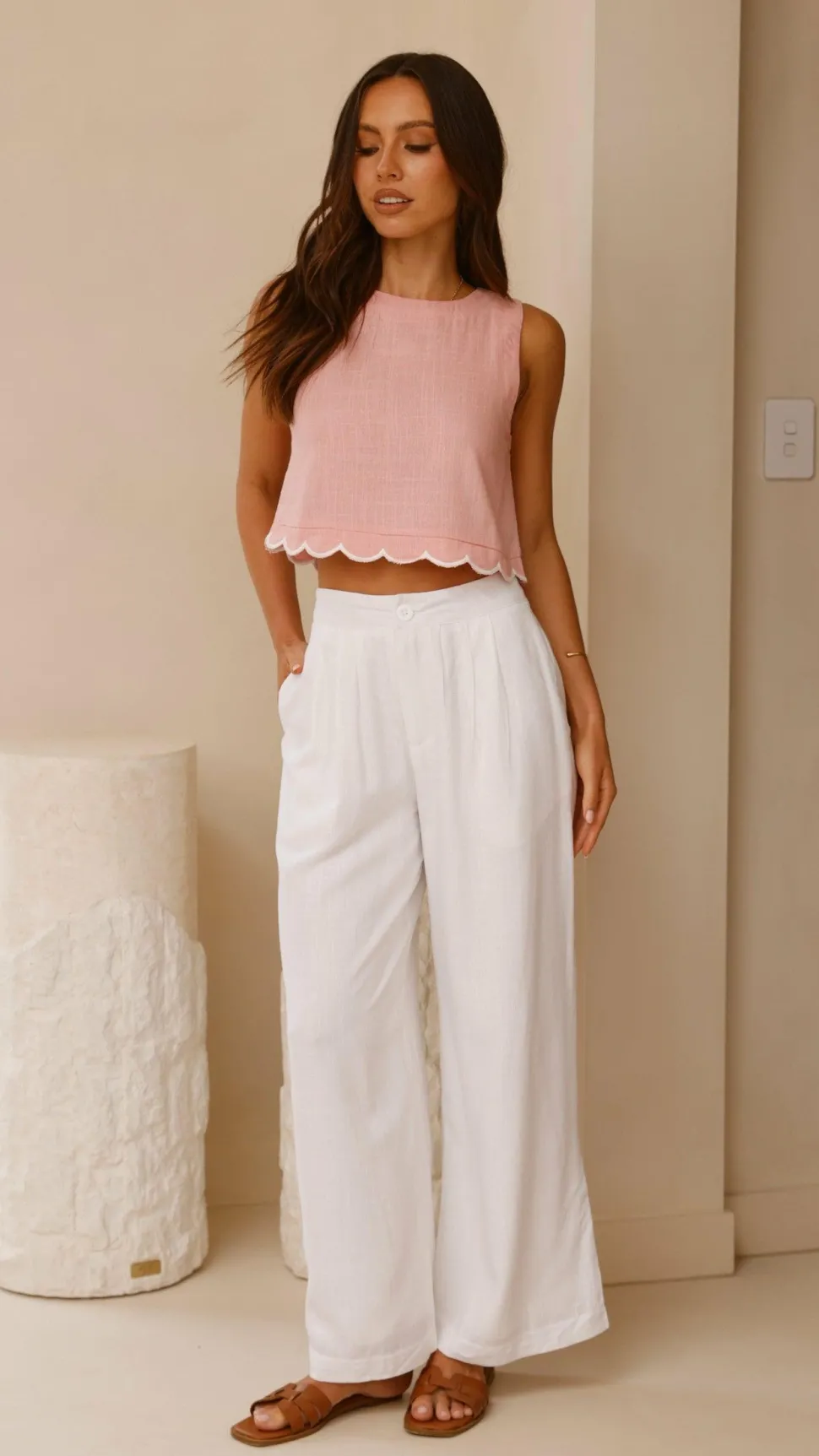 Get the look! Lexi Linen Pants – White & Gretal Slide – Tan