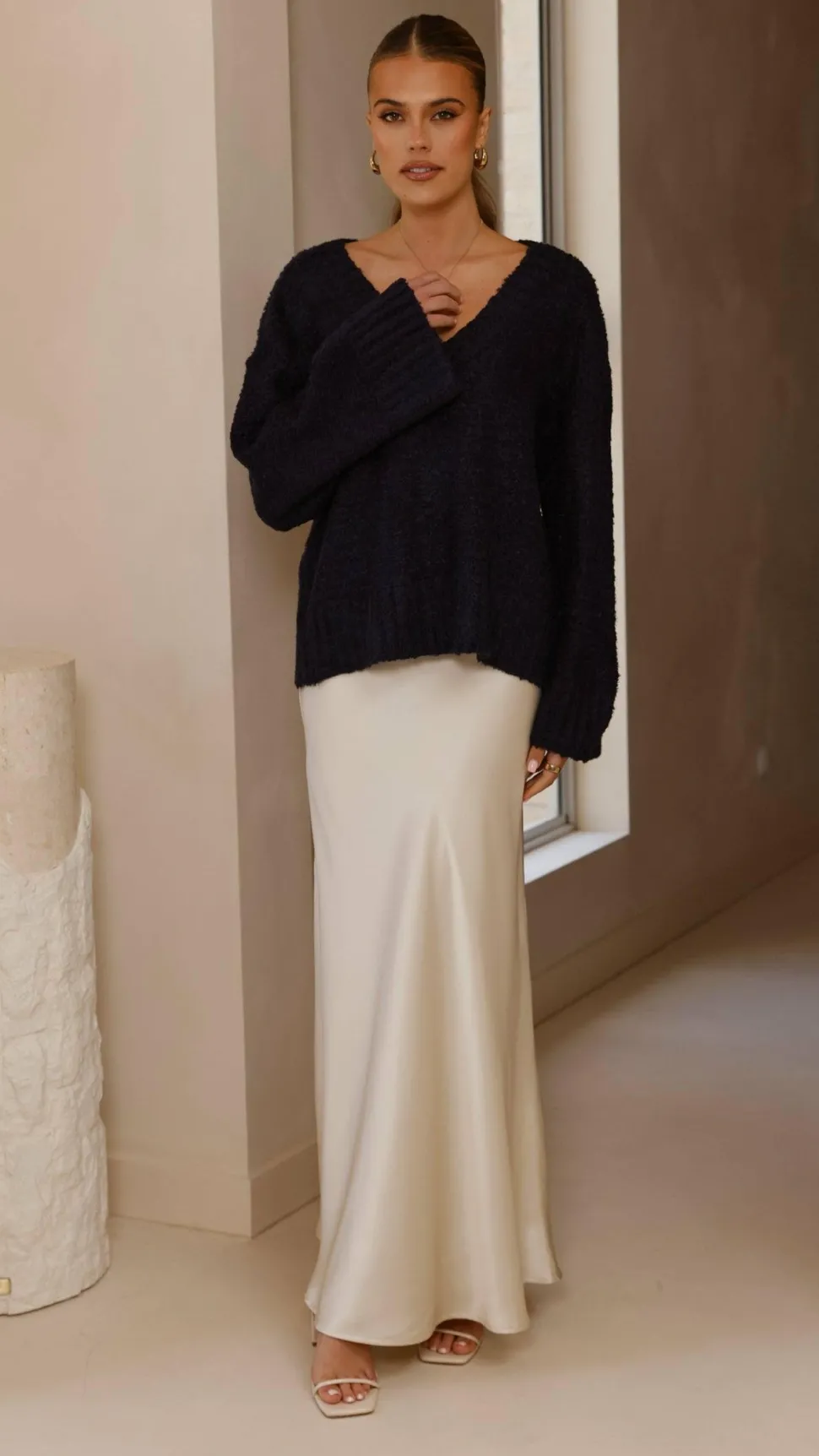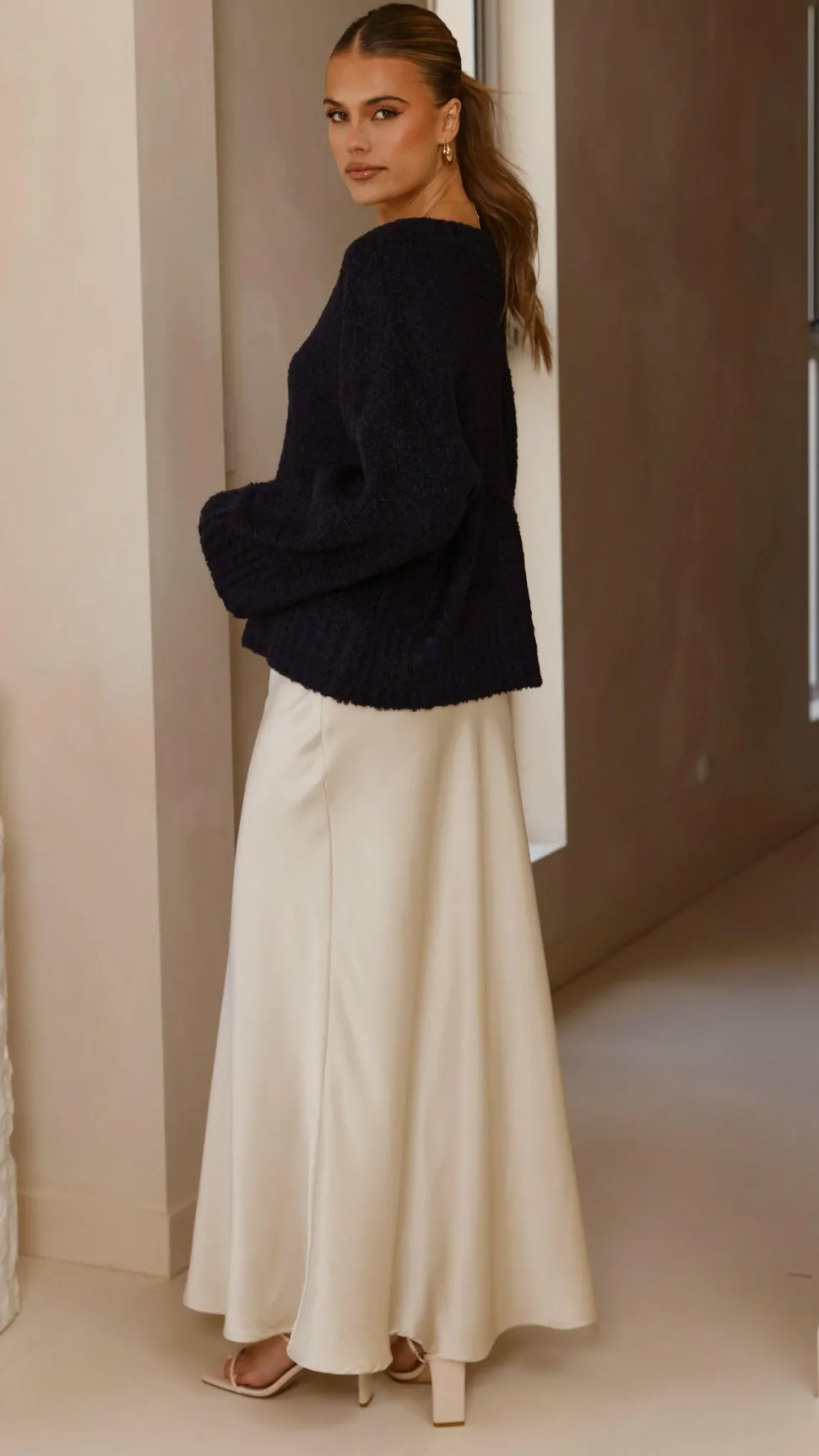 Get the look! Darina Bias Cut Maxi Skirt – Champagne & Urmi Heel – Ivory