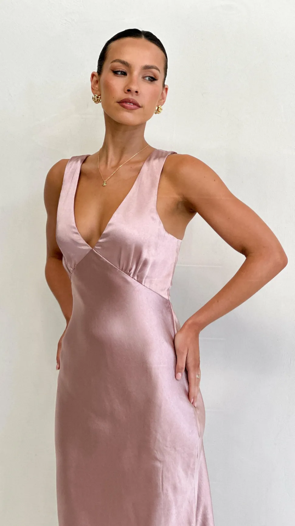 The Sofia Maxi Dress in Dusty Pink features a gathered bust detail and a V neckline, providing a flattering and stylish look. With a maxi length and thick back straps, this dress offers comfort and support. The invisible side zipper makes for an effortless and seamless fit. Perfect for any occasion.