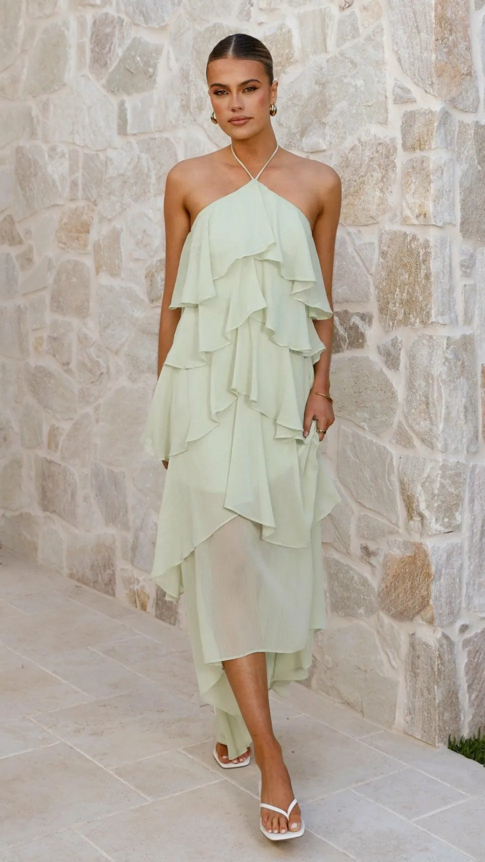 Elevate your style with the Soho Maxi Dress in Sage. This daring design features a halter neckline framed by delicate frill details, adding a touch of bold femininity. Fully lined for a flawless fit, it secures with a concealed center back zipper and hook and eye closure, ensuring both comfort and confidence from day to night.