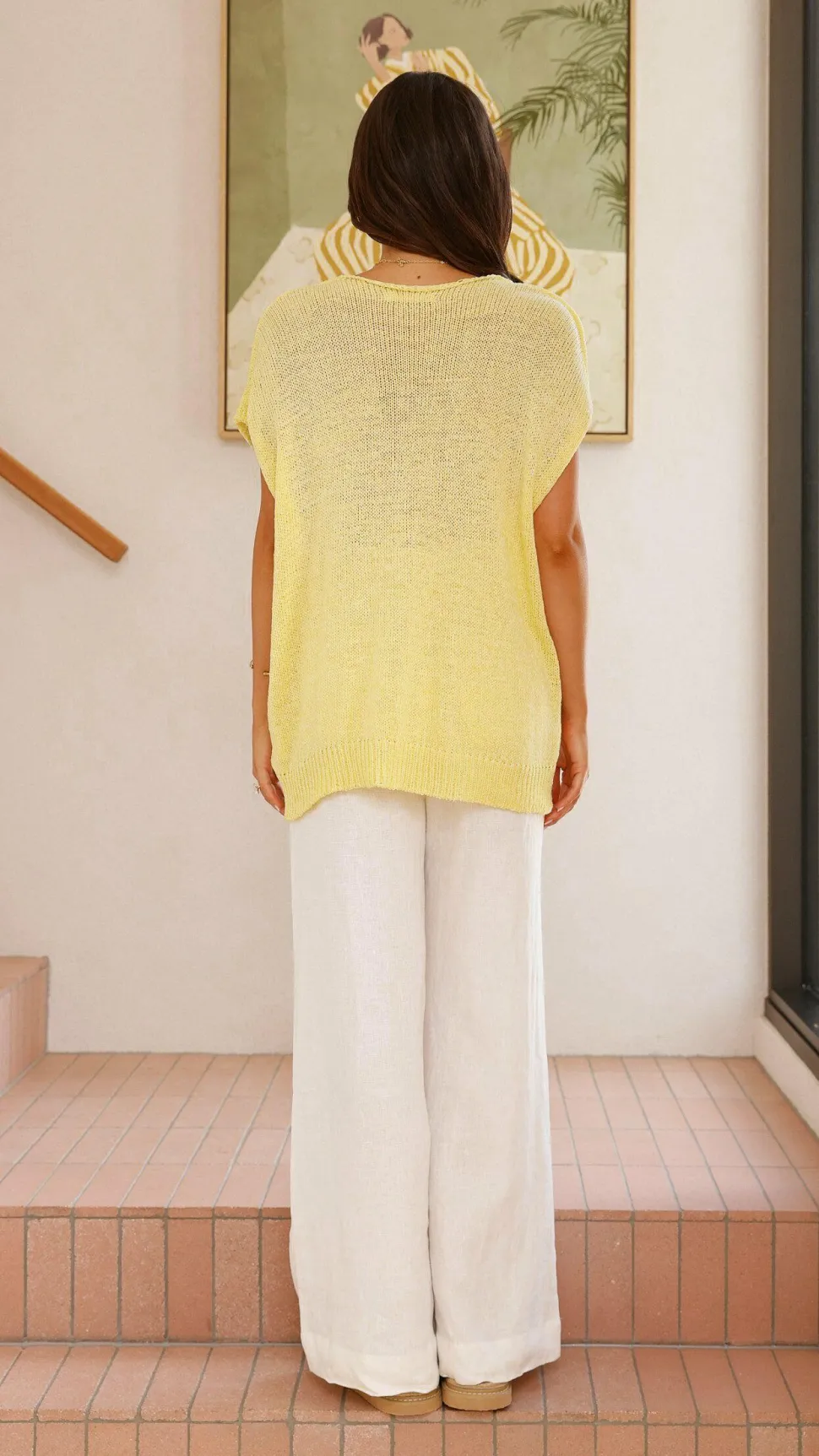 Get the look! Imogen Button Pants – Cream, Karah Pants – White & Yaelle Sandals – Teak, Amaya Slide – Clay