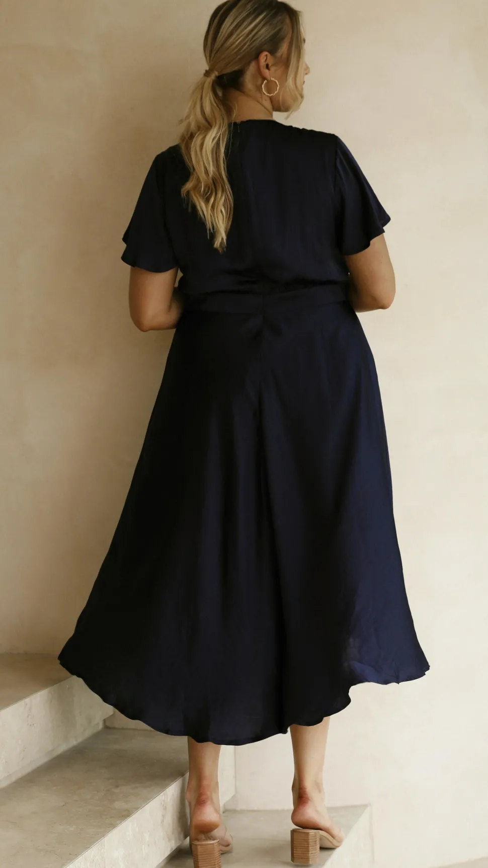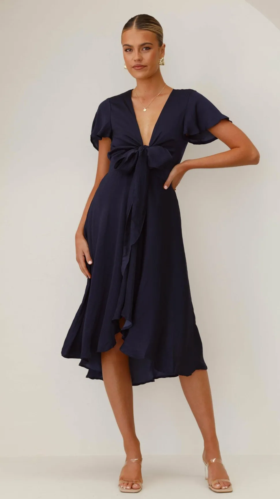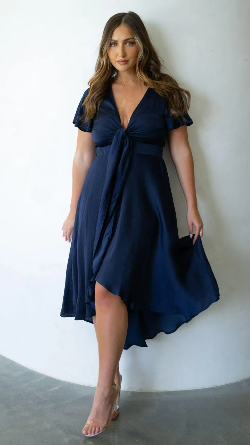 Our Sunny Daze Dress is a must have occasion piece, perfect for that upcoming party or wedding! This dress features butterfly sleeves, a soft satin feel and high low flowy skirt with a tight waistband. This piece will be your go to dress for impressing at any event, we suggest pairing with our Aena Heel Nude/Clearand Arya Hoop Earringsto finish the look.