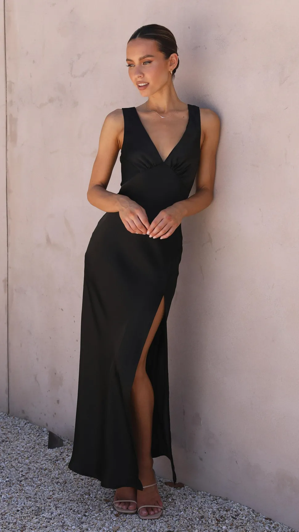 Our Taylor Maxi Dress is understated but elegant, the perfect occasion dress of the season. This luxe satin look maxi features a gorgeous plunge neckline and high leg slit to create a flattering silhouette.