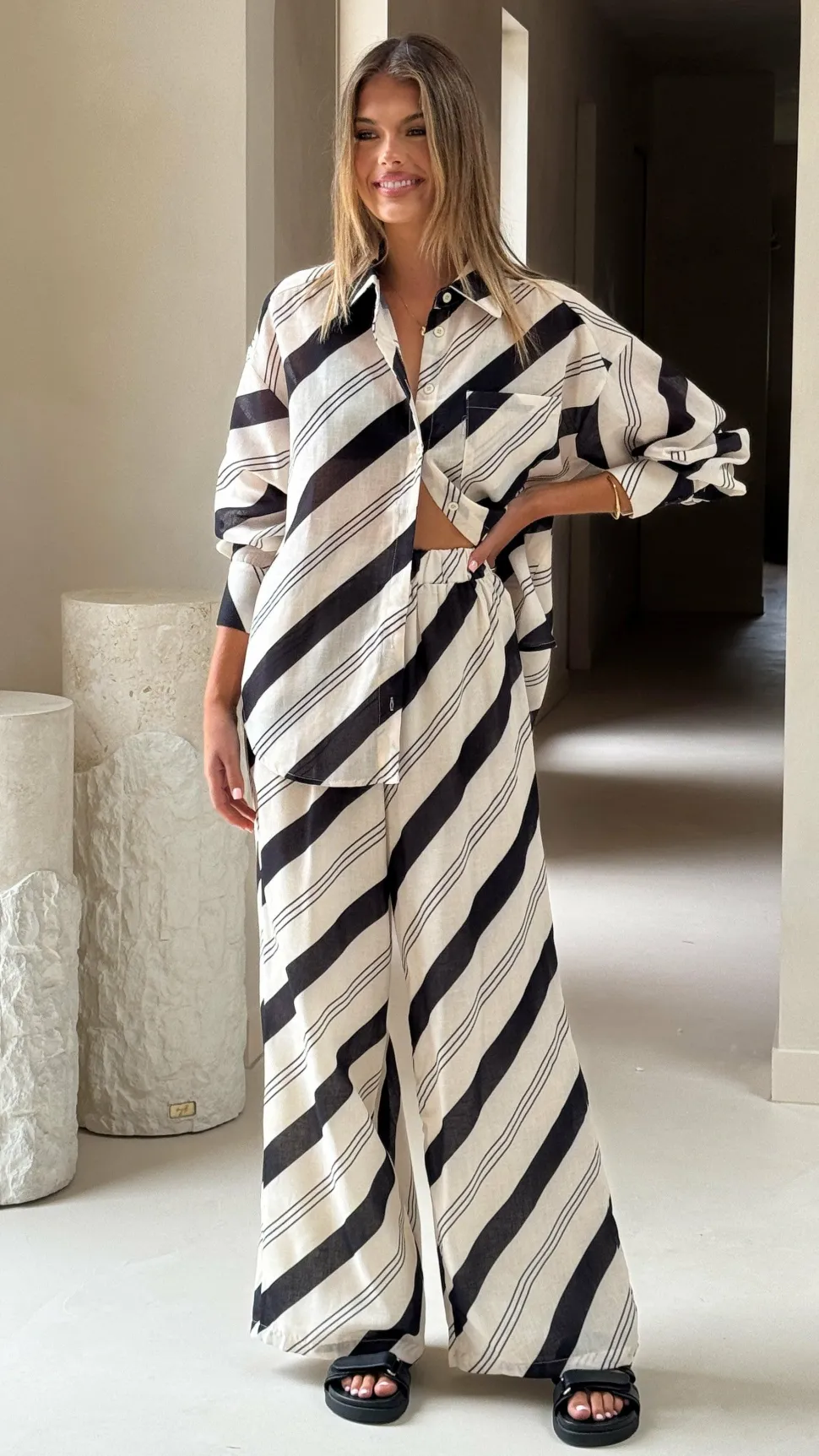 Get the look! Torrey Button Up Long Sleeve Shirt – Black/Cream & Amylee Slide – Black