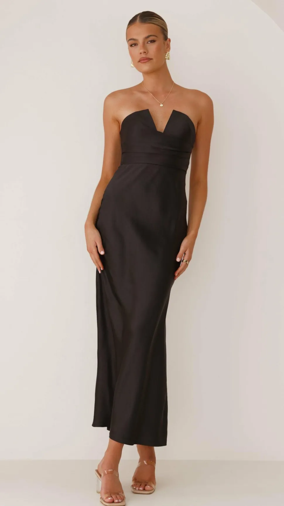 This Valerie Maxi Dress in Black features a stunning V bust design and gathered detailing on the side for an elegant touch. The full length style and padded bust provide both comfort and style, while the strapless design and invisible back zipper add a touch of sophistication. Perfect for any special occasion.