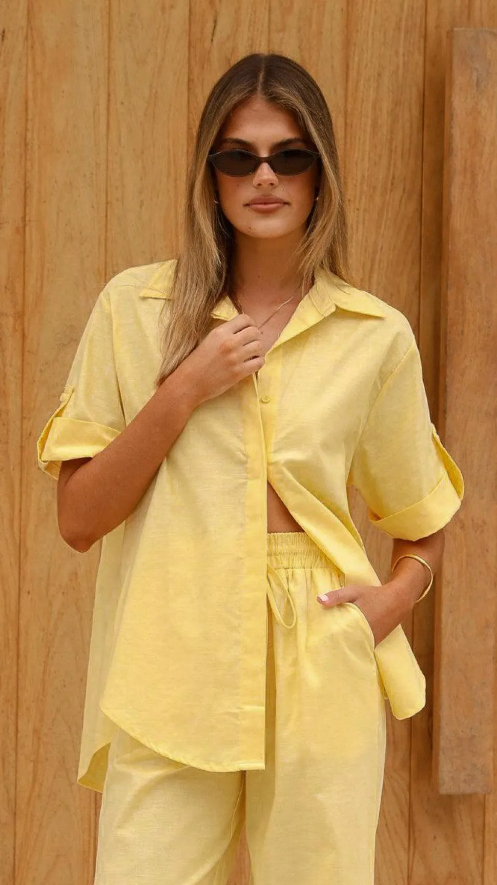Get the look! Valene Pants – Yellow & Yaelle Sandals – Teak