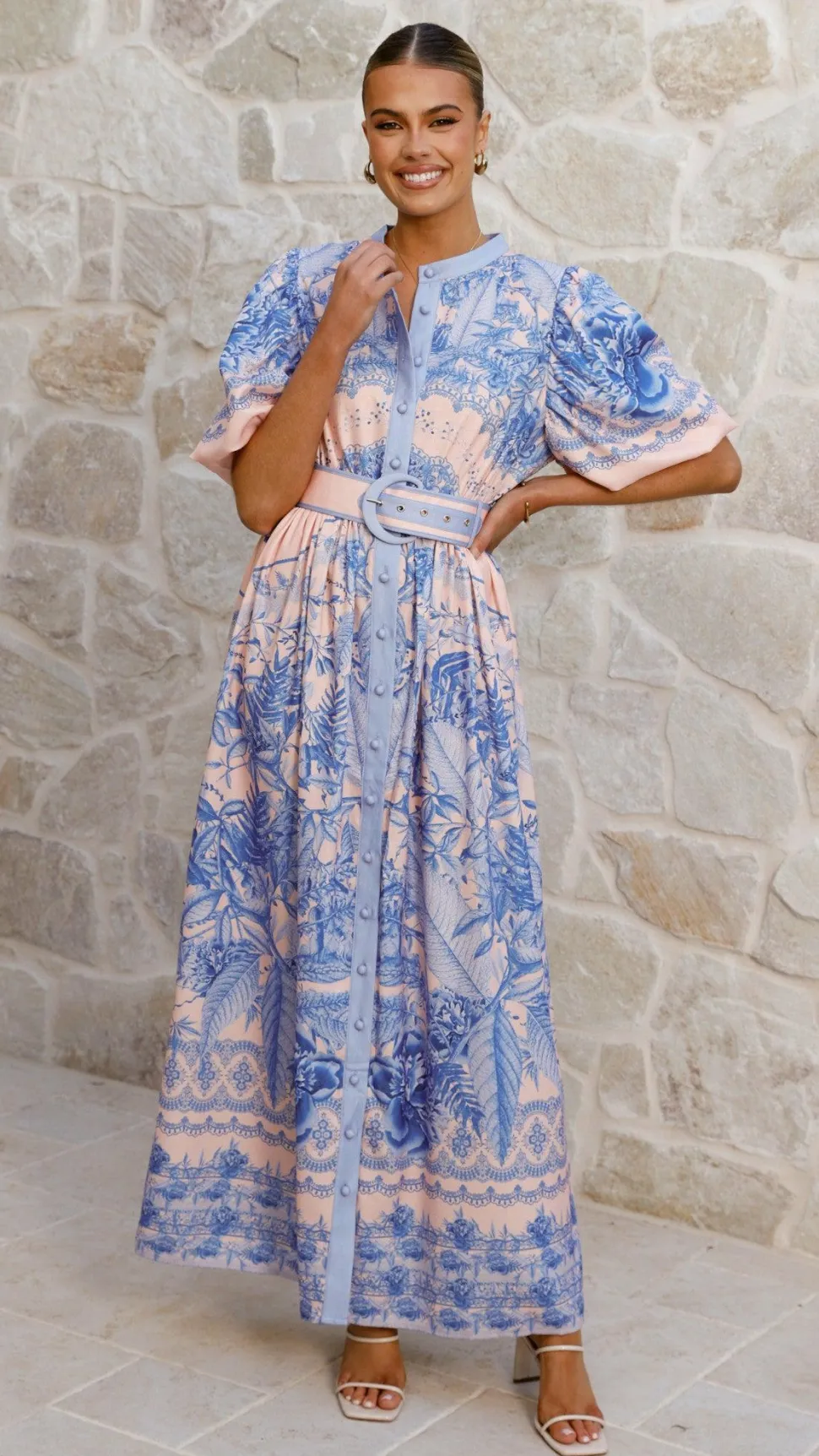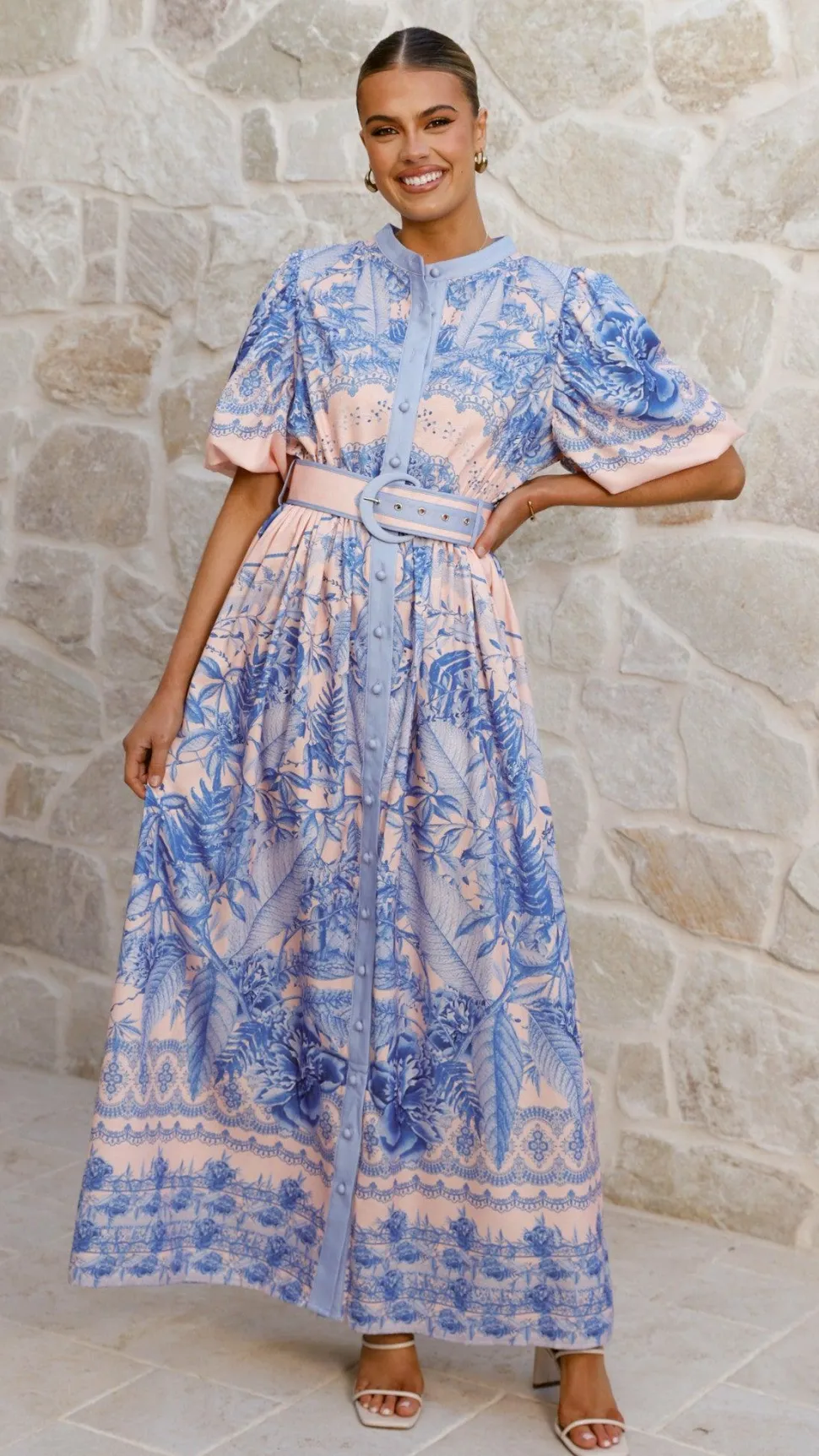 This elegant maxi dress features a high neckline and short puff sleeves, complemented by fabric-covered buttons down the front. It includes a thin elasticated waistband and a detachable waist belt for a tailored fit.