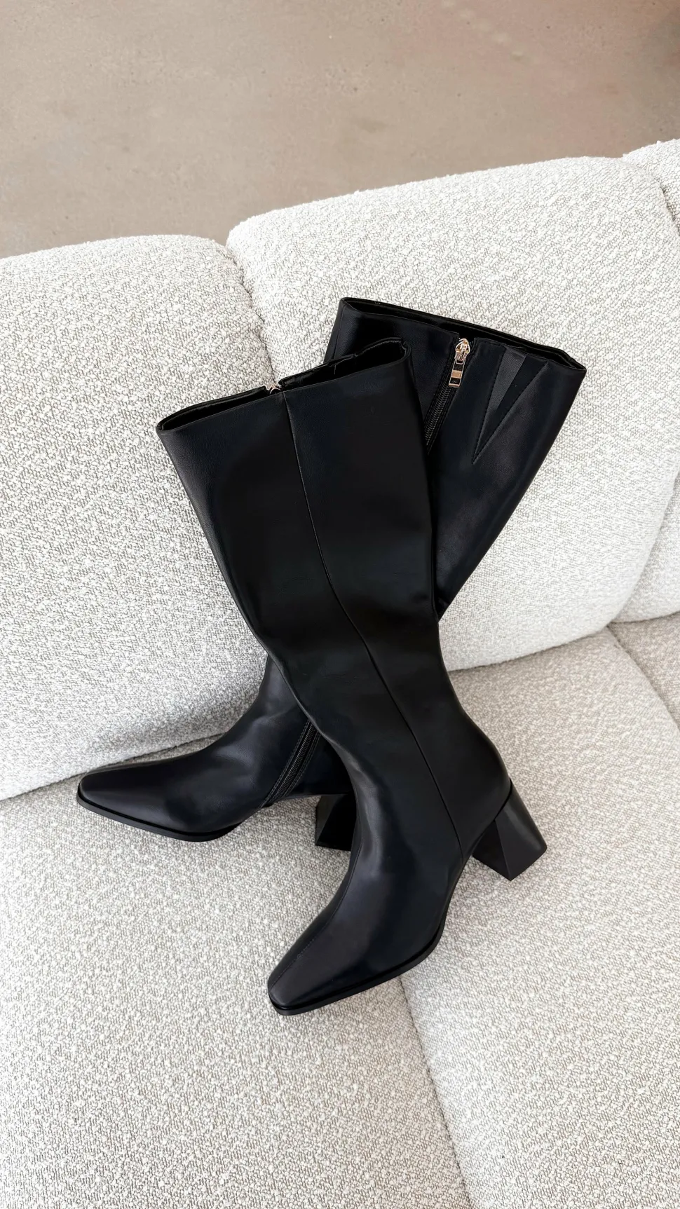 This long block heeled boot adds a contemporary edge to any of your outfits, a true wardrobe staple.