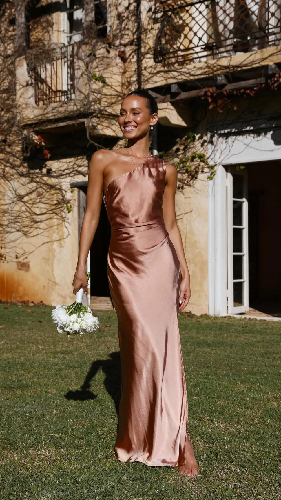 Crafted with elegance in mind, the Victoria Maxi Dress will elevate your style to new heights. Featuring a chic one shoulder design and a gathered waist, this dress provides both comfort and sophistication. With a knee high side leg split and invisible side zipper, this maxi length dress is perfect for any occasion.
