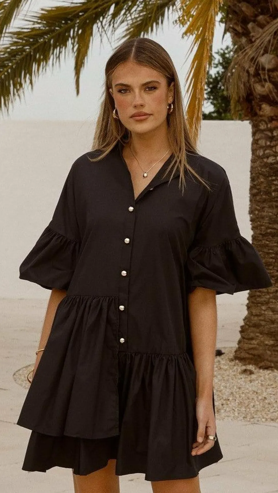 This mini dress features a short flared sleeve design and gold button accents along the front. It includes a tiered skirt and offers a relaxed fit, crafted entirely from 100% cotton for comfort and breathability.
