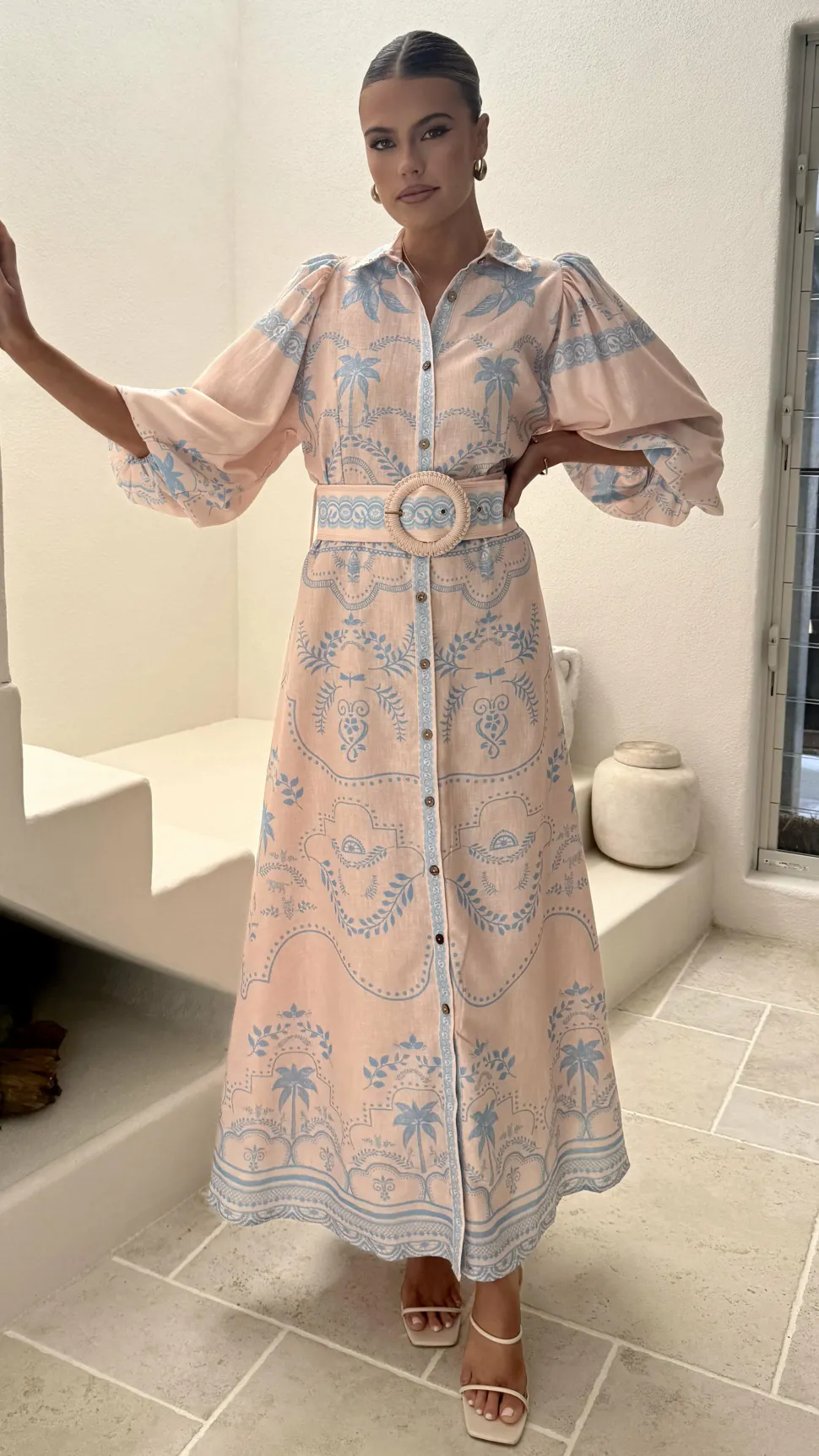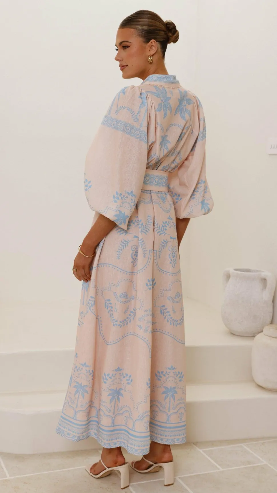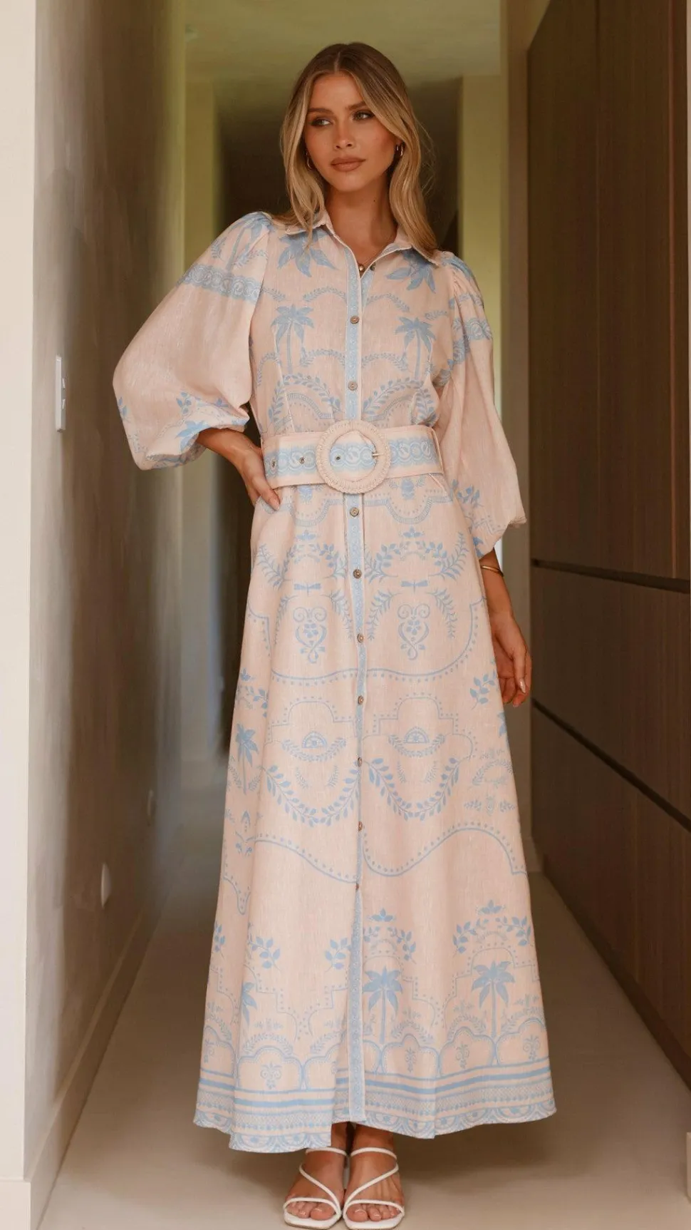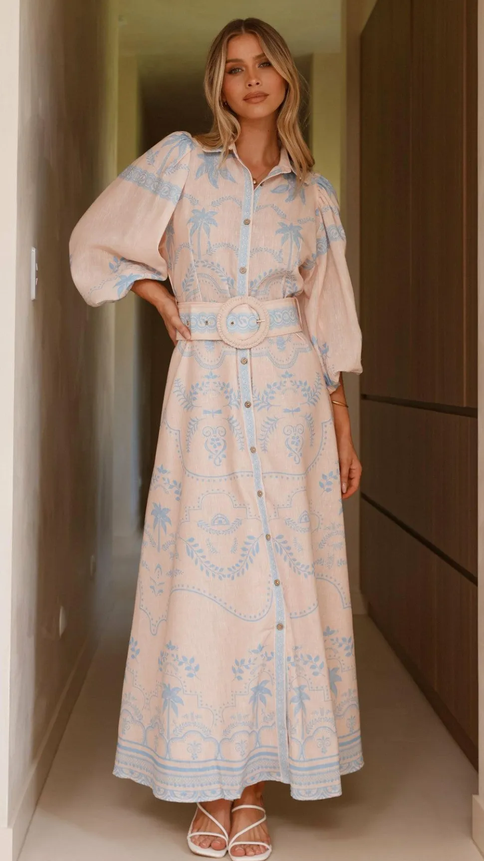 This elegant maxi dress features a collared neckline and a button-down front. It boasts long balloon sleeves finished with elastic cuffs and includes a detachable waistbelt for a customizable fit. The dress is partially lined, offering both comfort and style.