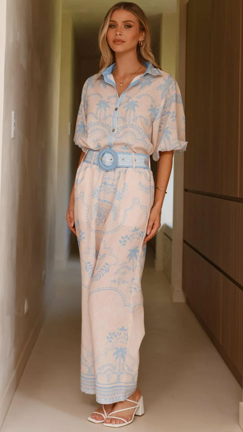 Get the look! Xander 3/4 Sleeve Button Down Shirt – Blue & Yazmin Heel 2.0 – White