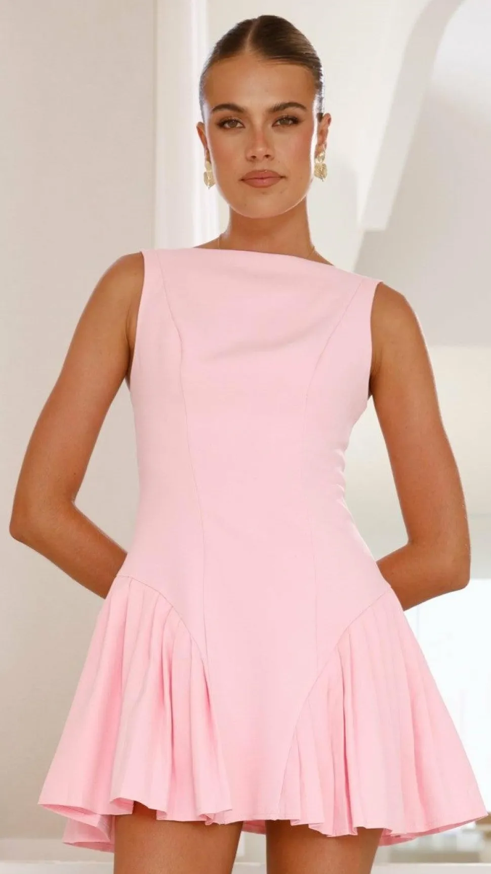 This baby pink mini dress features a pleated detail on the side and wide adjustable straps with silver hardware. It showcases a high neckline, elegant paneling, and an invisible zipper at the center back for a seamless finish.