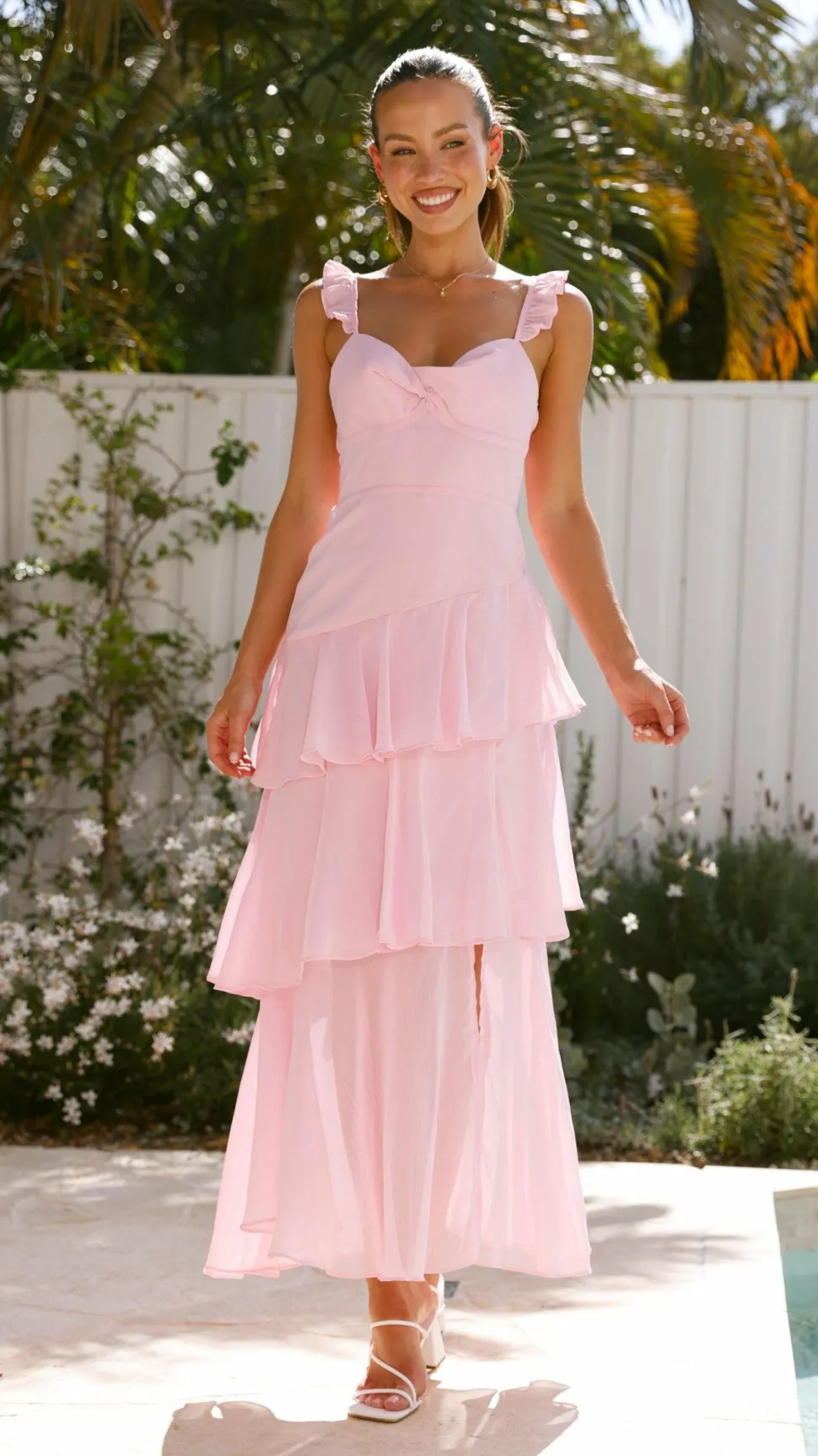– Adjustable straps with ruffle detail