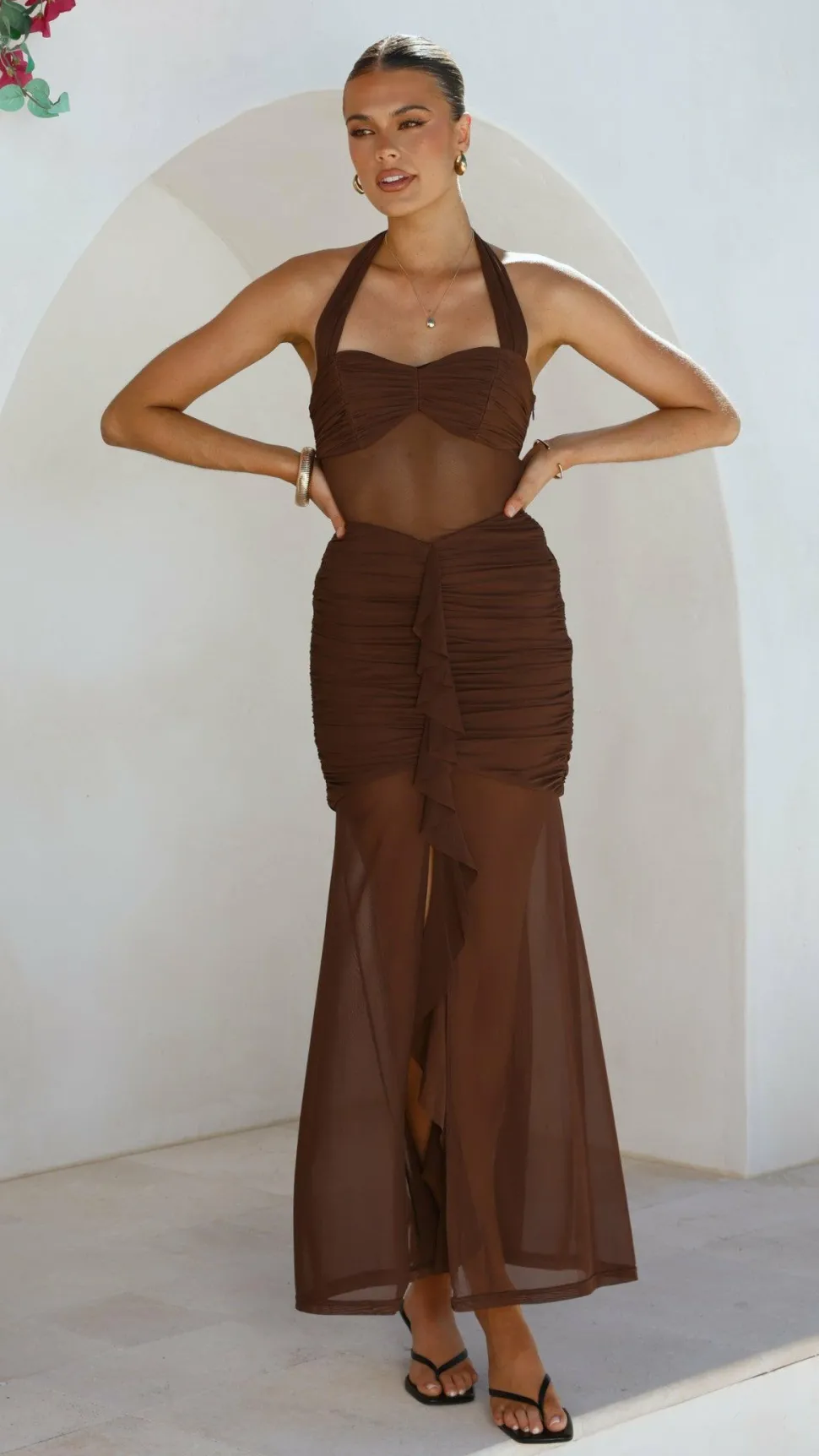 The Alani Maxi Dress in chocolate offers a floor-length silhouette with a halter neck tie closure. It features a silicone gripping in the bust for added support, and a sheer waist. An invisible side zipper ensures a seamless look, while the sheer skirt with a front slit and delicate frill embellishments at the front add a touch of sophistication.