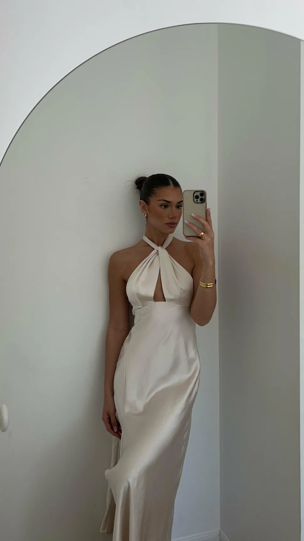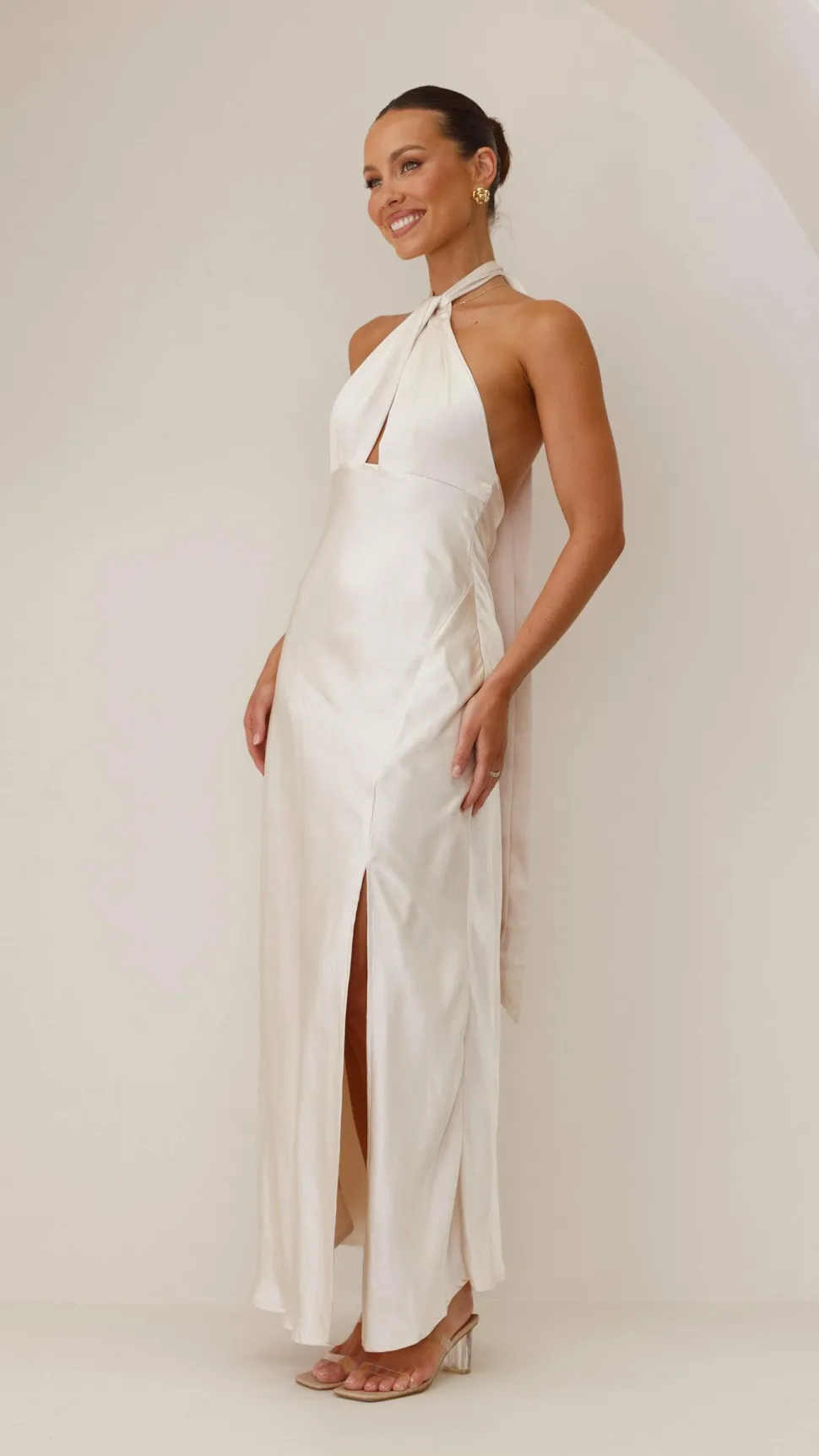 The Amalia Maxi Dress will be a stunning new addition to your wardrobe featuring a halter neck cut out detailing,adjustable neck tie, side slit and an enclosedzipper at the back. Pair it withtheYachi Heels – Nudeand gold jewels for a perfect evening look.