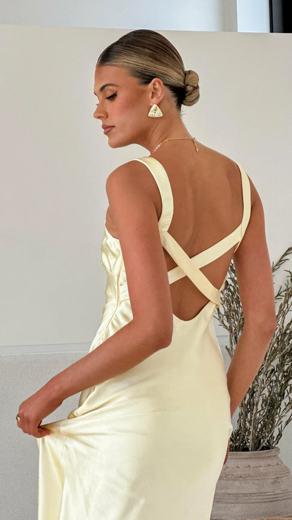 This elegant maxi dress features a V-neckline with a triangular bust and wide fixed straps. It includes an invisible side zipper and a low scoop back adorned with cross detailing. The dress is fully lined for a polished finish.