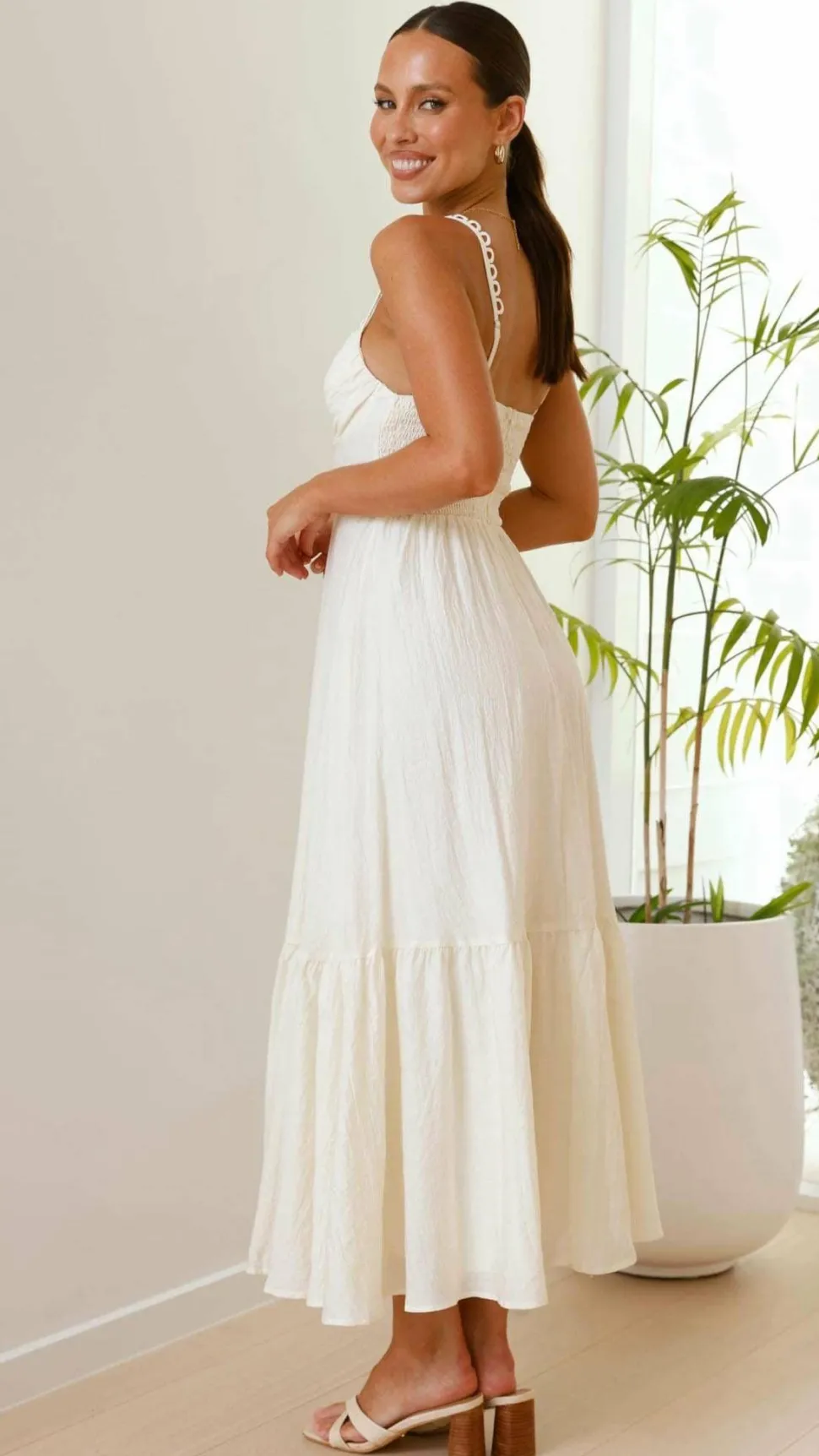 – Fitted waist, shirred at back