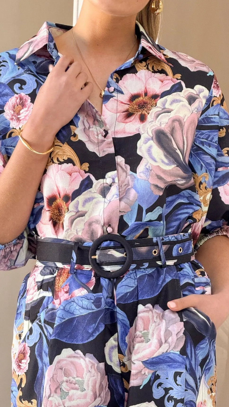 Get the look! Sammy Button Down Shirt – Azure Donatella & Chantel Heel – Black