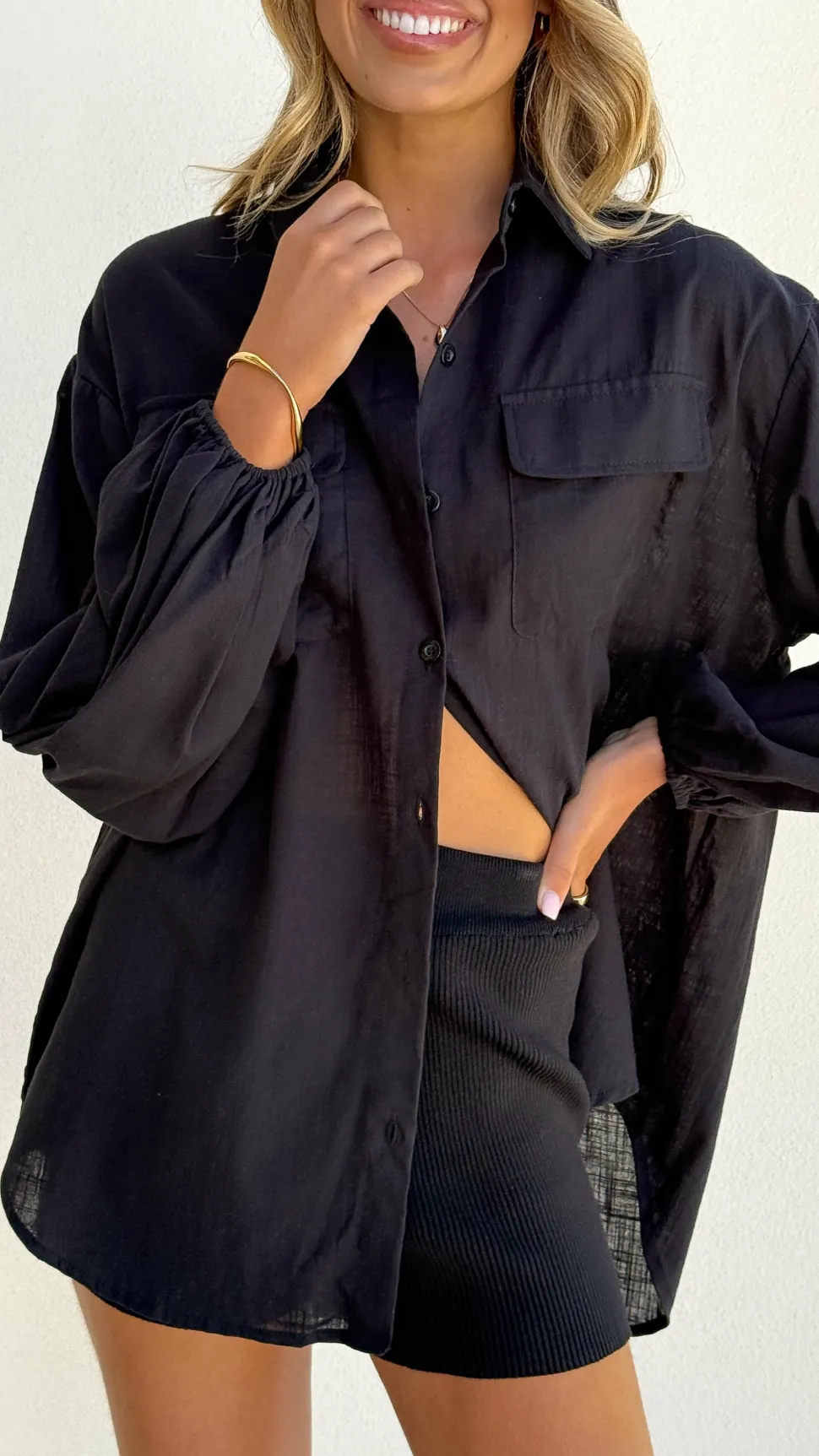 Get the look! Amaya Slide – Clay & Bianca Oversized Button Up Shirt – Black
