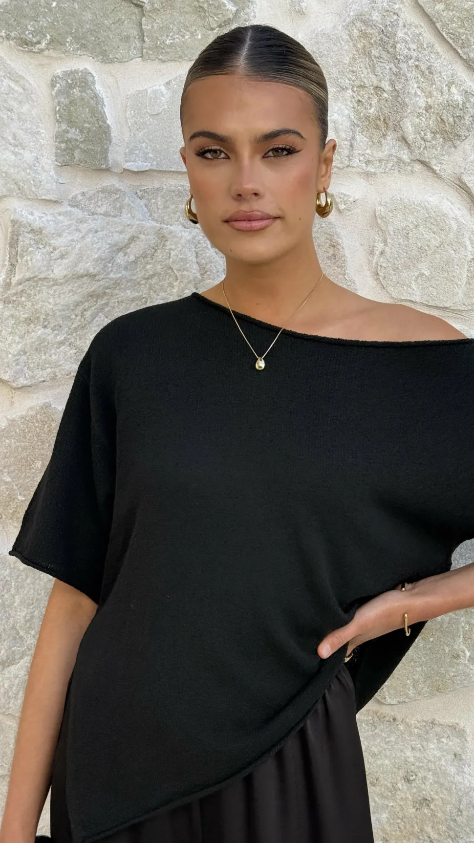 Elevate your wardrobe with the Blair Off Shoulder Tee in Black, crafted from a delicate knit fabric that offers a subtle semi-sheer effect. Its wide neckline and off-the-shoulder design create an elegant silhouette, while the rolled hems add refined detail. Perfect for sophisticated styling, this tee blends comfort with understated allure.